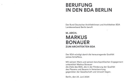 Der Bund Deutscher Architektinnen und Architekten BDA Landesverband Berlin beruft M. Arch. Markus Bonauer zum Architekten BDA.