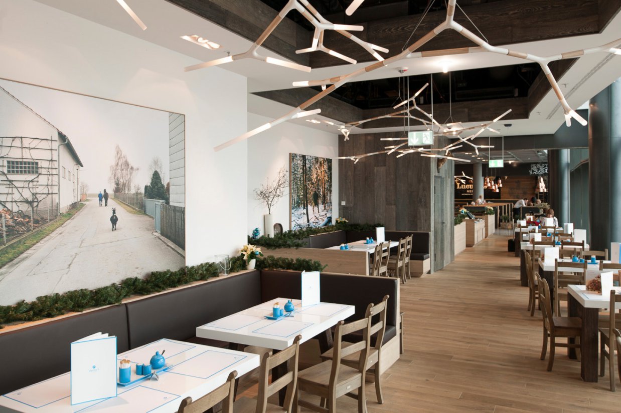 Für das Restaurant wurde ein eigenständiges Lichtsystem entwickelt, das die Decke des Restaurantbereichs bespielt. Vorbild für das System “Lichtgeweih” waren großformatige historische Kronleuchter und Geweihtrophäen alter Jagdstuben.