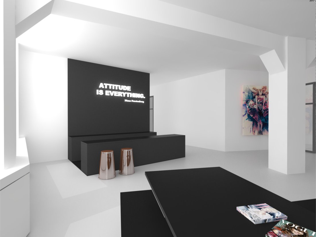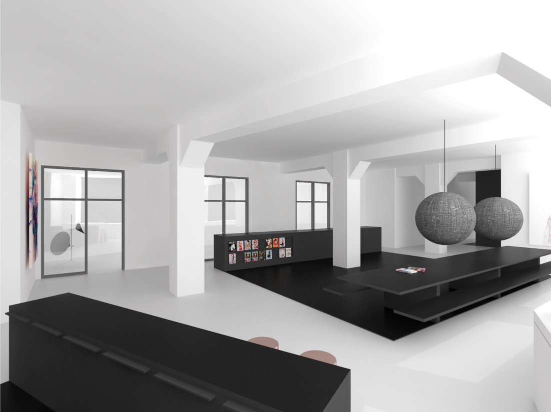 Das Konzept bewahrt den industriellen Charakter der unter Denkmalschutz stehenden ehemaligen Wäschefabrik aus dem Beginn des 20.Jh. Das freigelegte Beton-Tragwerk mit seinen gevouteten Deckenübergängen wird sanft renoviert. Grafisch klar gefasste Rauminseln mit Möbelobjekten zonieren das fließende Raumgefüge der Allgemeinbereiche und stehen im Kontrast zu der rohen Bestandsstruktur.