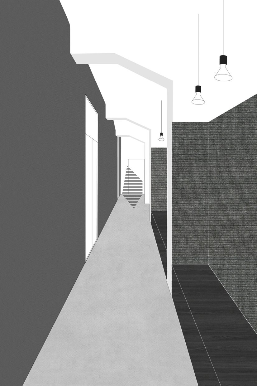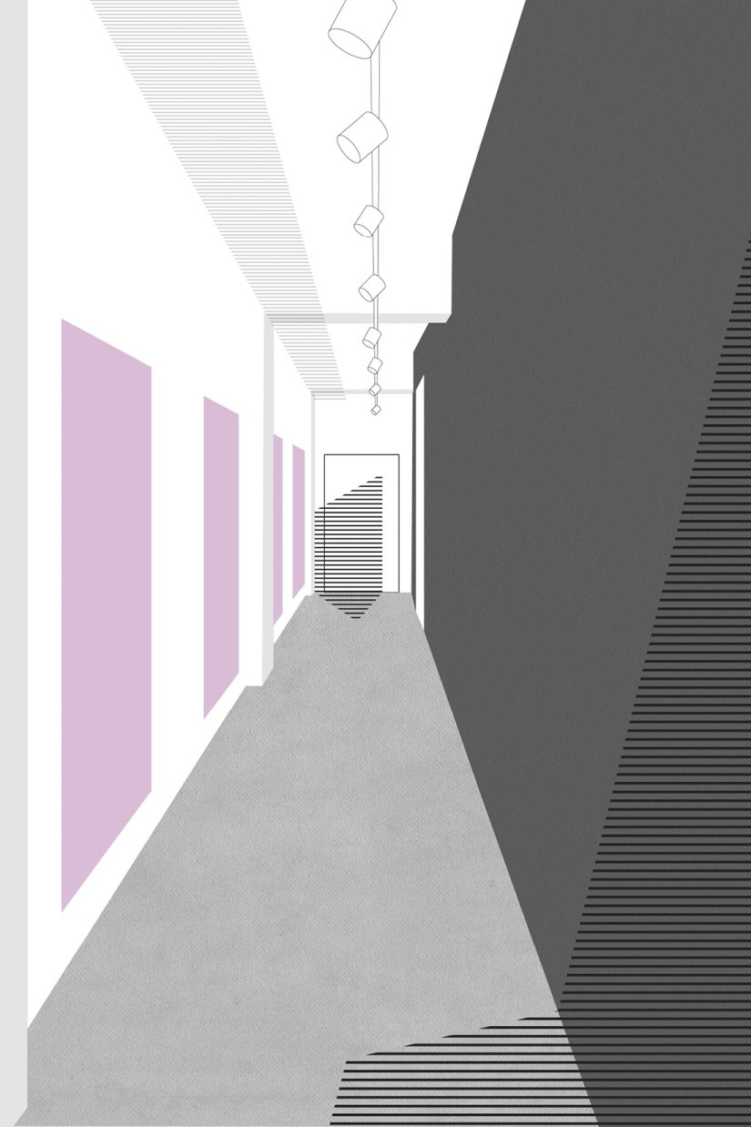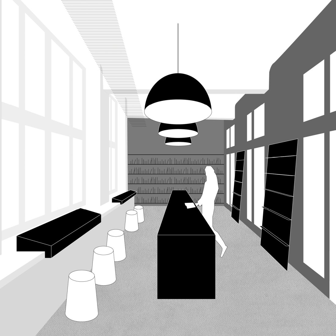 Die Flure zu den Unterichtsräumen werden mit eingebauten Sitznischen zu informelle Kommunikationsbereichen, die Wände dienen als Galerie ausgewählter Studienarbeiten. In der Bibliothek inszeniert ein 4m langer ‚Book Table‘ das Thema Buch und Recherche.