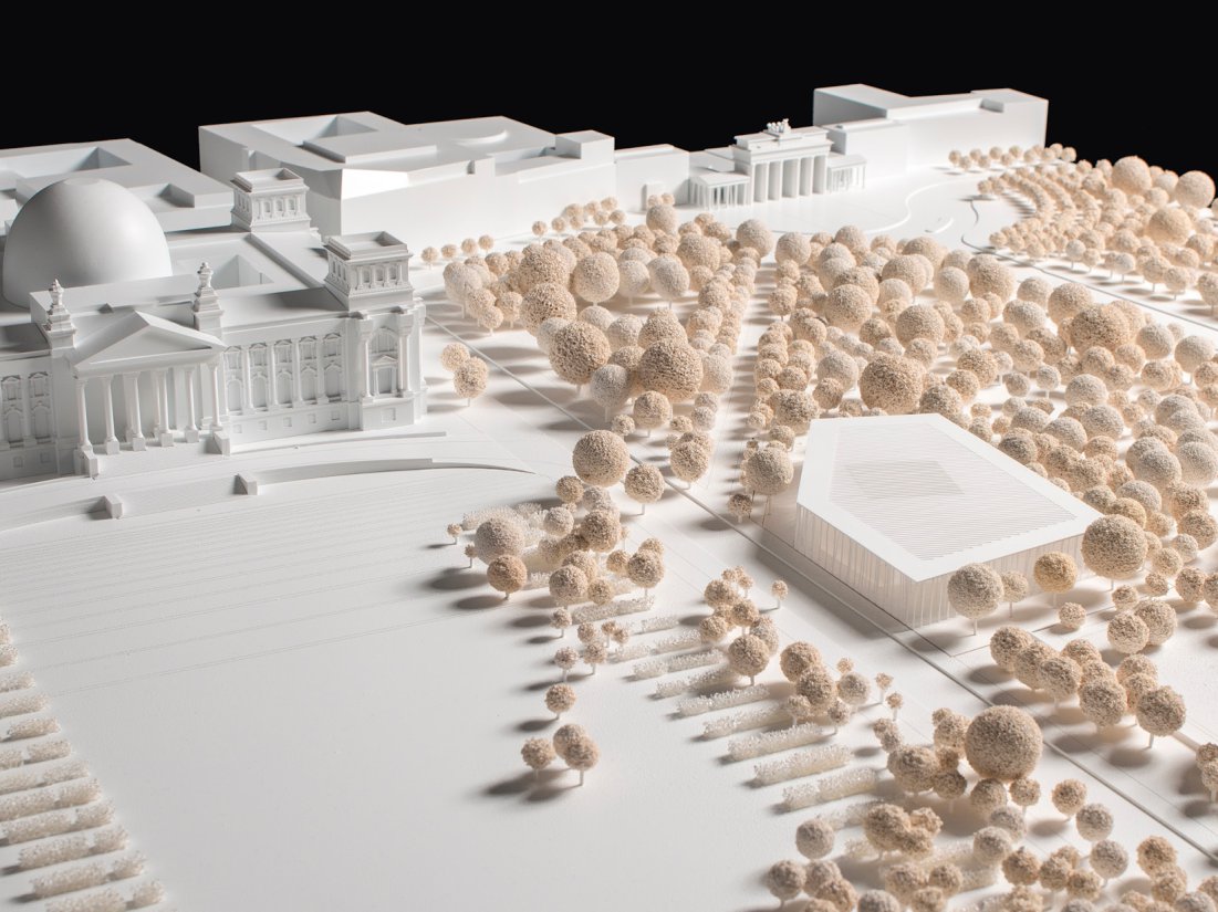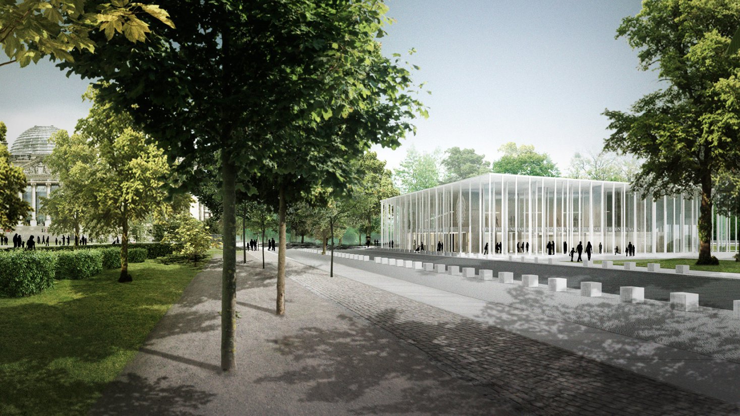 „Mit filigraner Leichtigkeit fügt sich der Entwurf einerseits in das Ensemble der Parlaments- und Regierungsbauten ein und verwebt sich andererseits gleichzeitig mit den Gehölzen des Tiergartens.