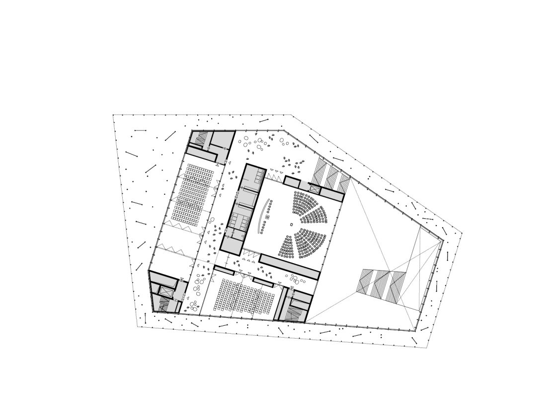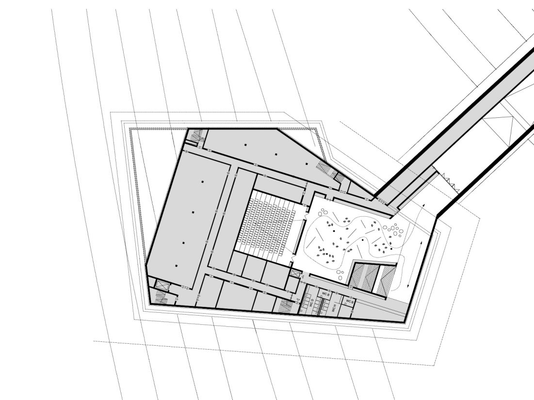 Die polygonale Geometrie des Gebäudes generiert sich aus den Richtungen der angrenzenden Wege, wodurch die bestehenden Alleebäume erhalten und die Baugrenzen zu den Nachbargrundstücken respektiert werden können. Diese zwingend einzuhaltenden Abstände sind auch bei der Planung der Baugrube zu berücksichtigen.
