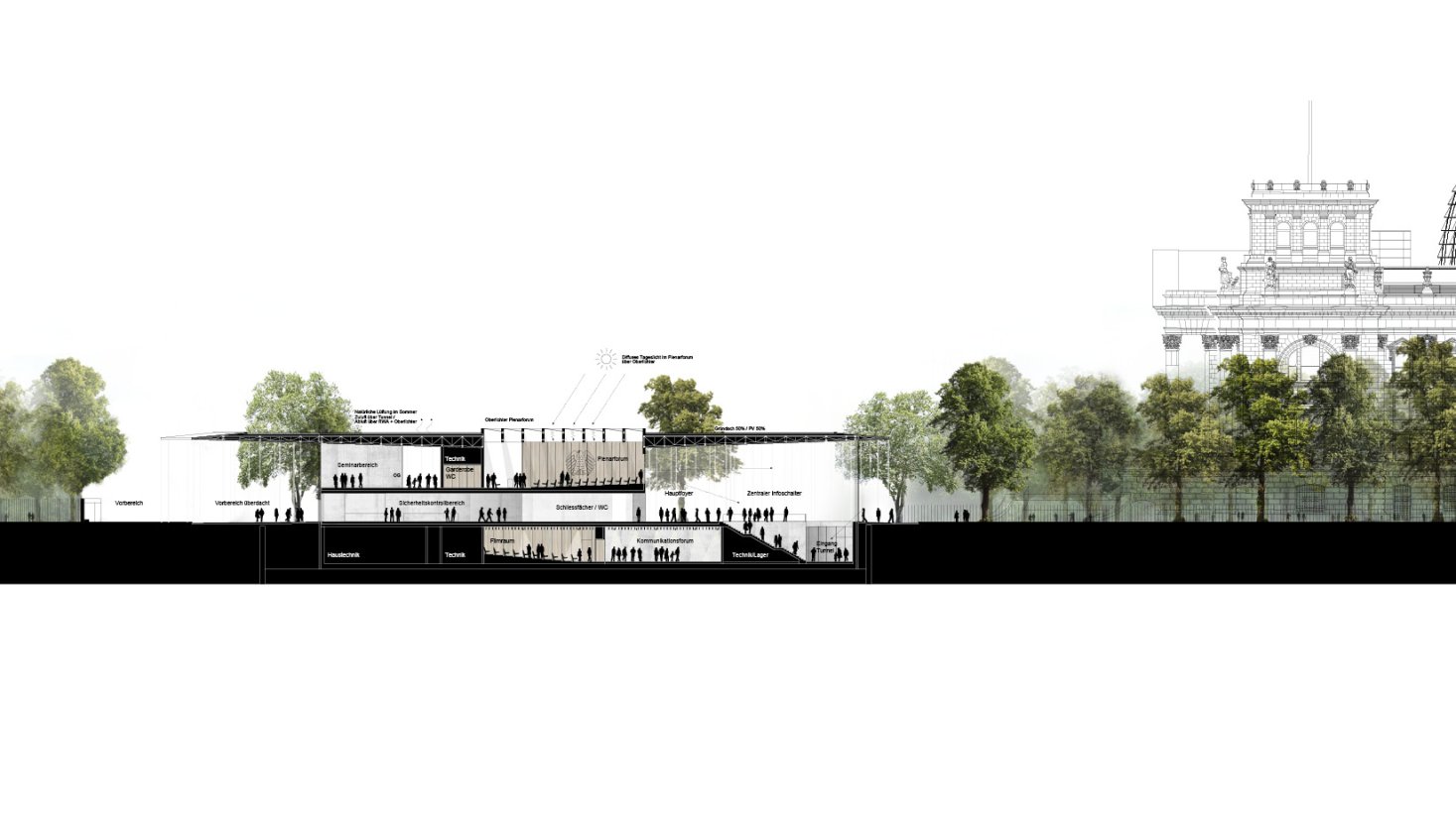 Innerhalb des denkmalgeschützten Ensembles des Regierungsviertels versteht sich der Entwurf für das Besucher- und Informationszentrum des Deutschen Bundestages als leichte und filigrane Architektur die zukünftige Besucher mit Offenheit und Transparenz empfängt. Die städtebauliche Strategie beruht dabei auf Erhalt und zurückhaltender Ergänzung.