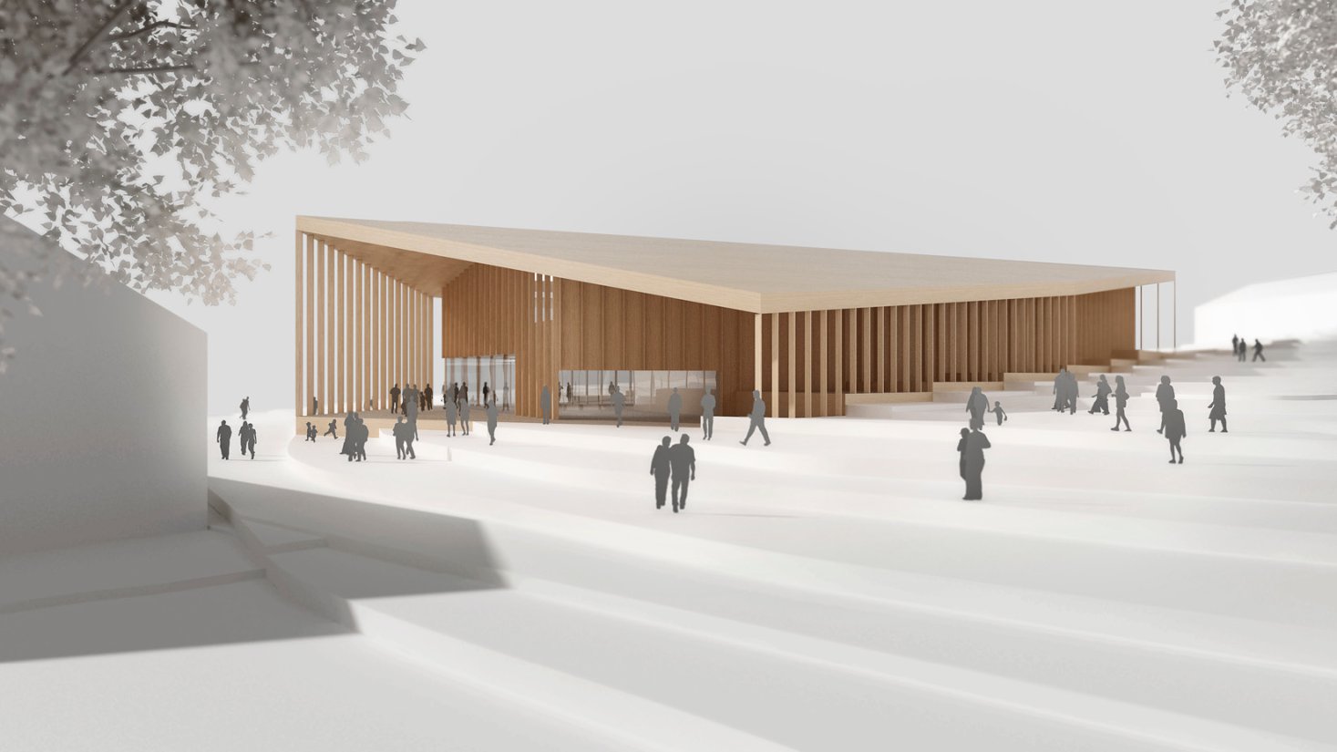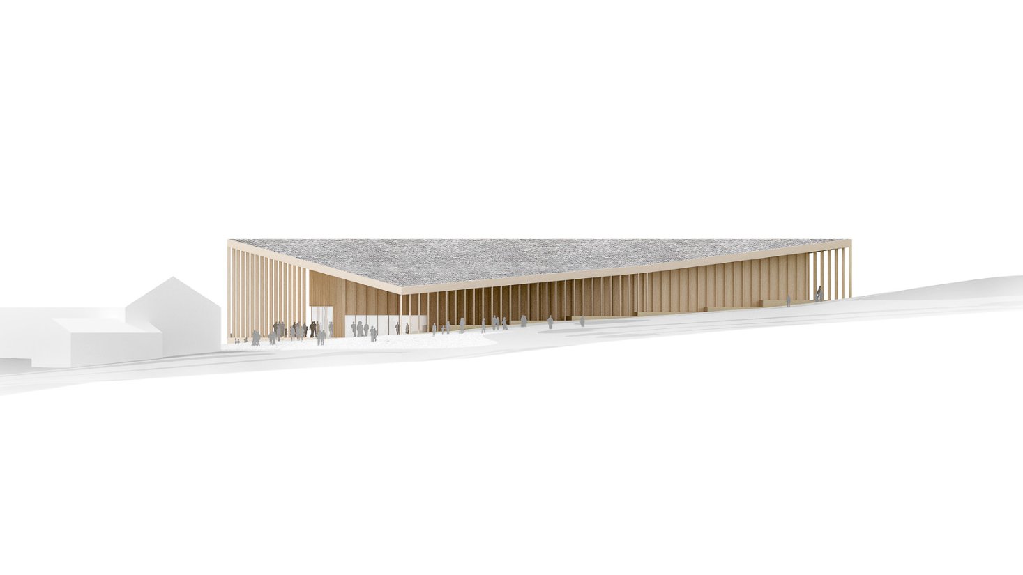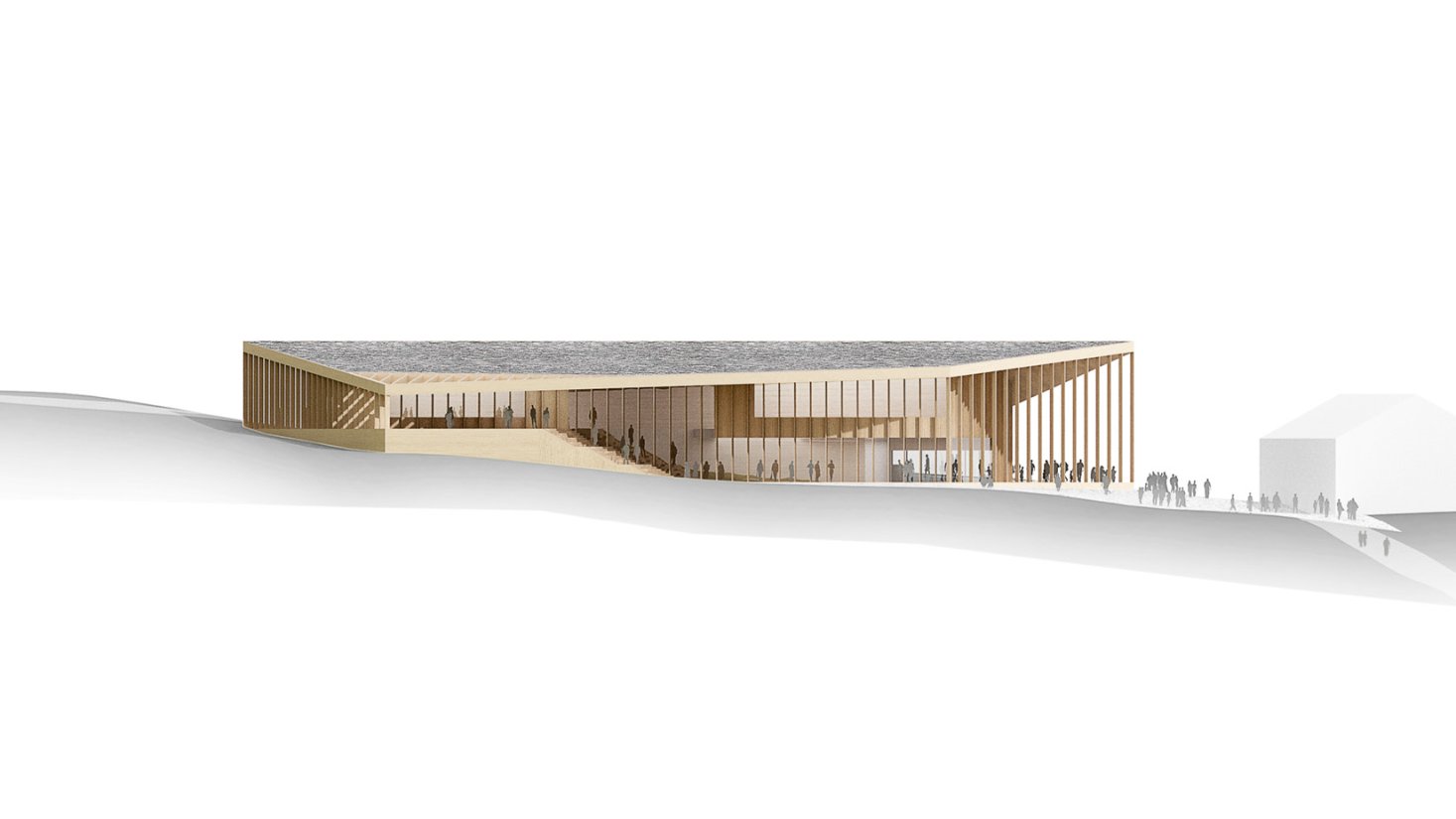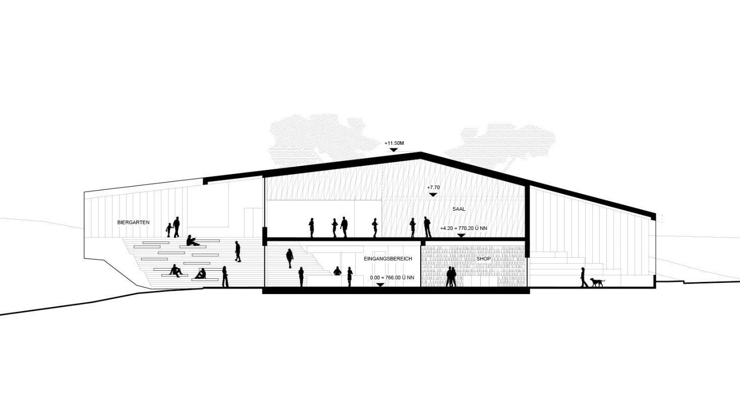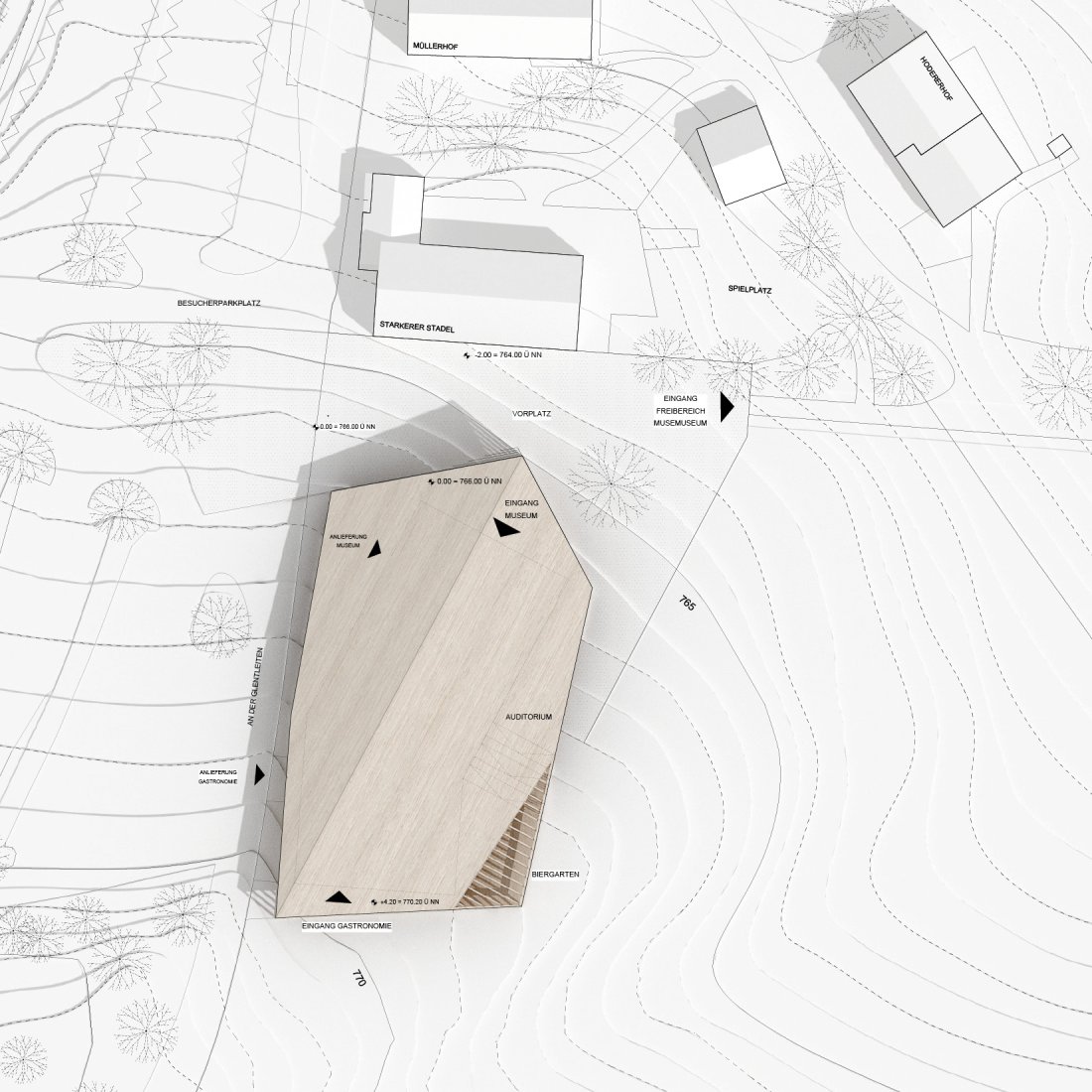 Der Entwurf vereint sämtliche Nutzungen für das neue Eingangsgebäude unter einem großen, polygonal geformten Dach. Unter diesem Dach entfalten sich die Programmflächen als terrassierte Landschaft und nehmen das Gefälle der umgebenen Topografie auf. Durch die Verschränkung des Gebäudevolumens und der Dachform entstehen überdachte Freibereich die den Zugang zum Gebäude markieren und zu den Aussenbereichen der Gastronomie führen.