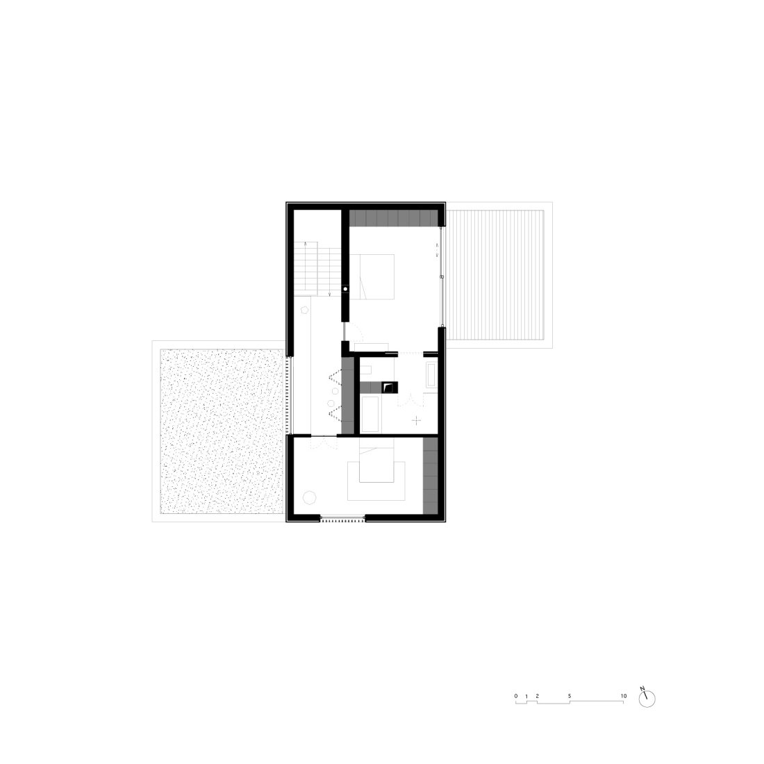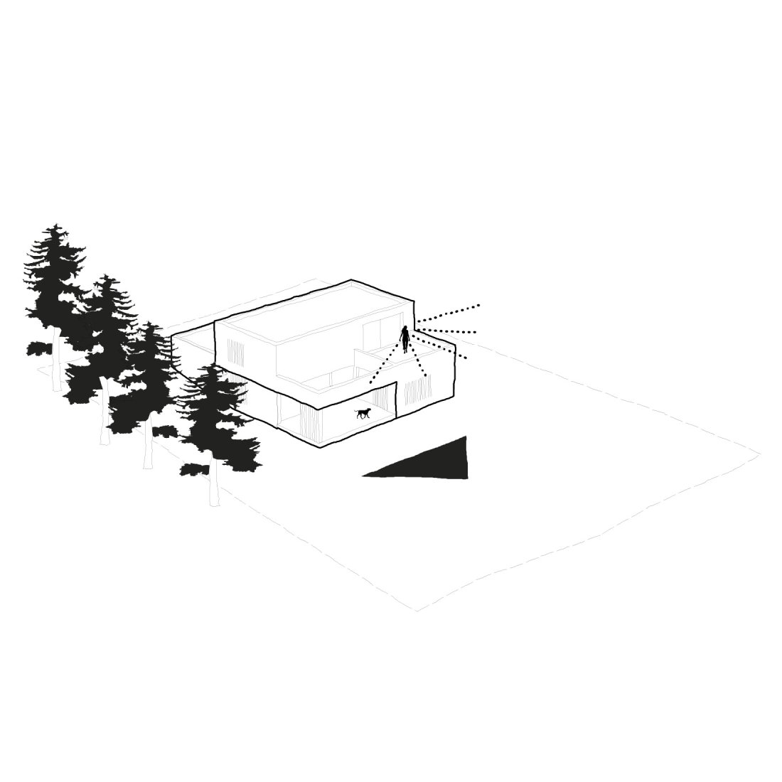 Die Kubatur des Gebäudes besteht aus drei rechteckigen Volumen, die mit Vor- und Rücksprüngen auf die sanfte Topographie der Umgebung reagieren. Das Gebäude fügt sich dabei sanft in die umgebene Wiesenlandschaft ein. Im Aussenbereich entstehen gefasste Raumsituationen mit großzügigen Terrassen die den Blick in die Landschaft inszenieren.