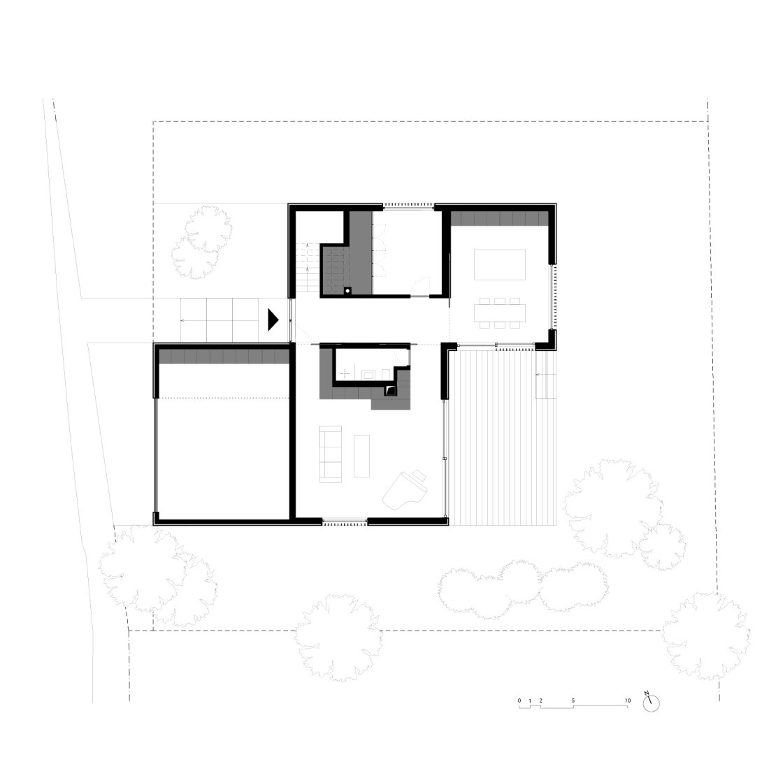 Die zentralen Wohnbereiche sind als fließender Raumverbund organisiert und verbinden sich über die großzügige Terrasse mit dem Garten. Im Obergeschoss befinden sich die