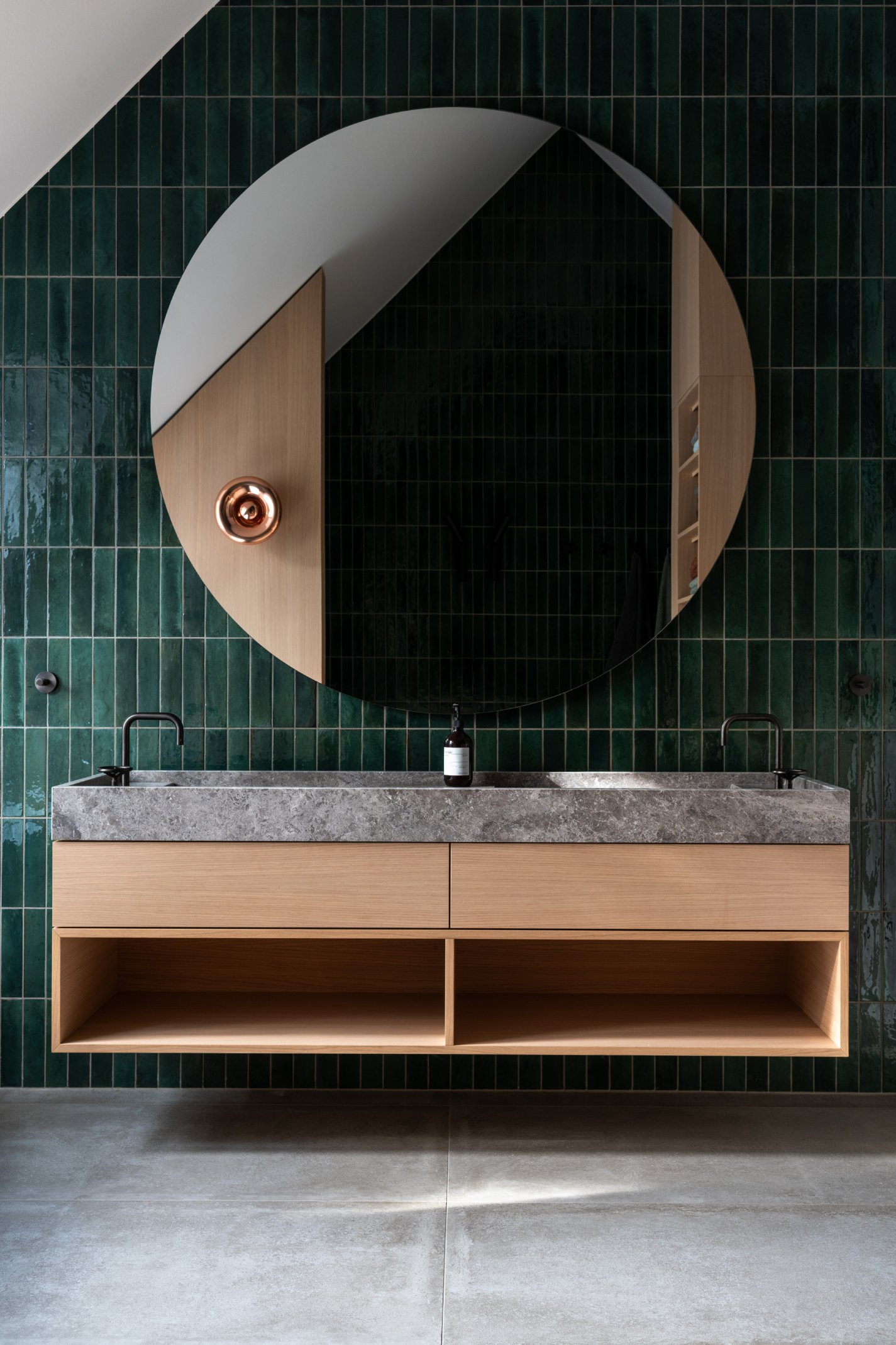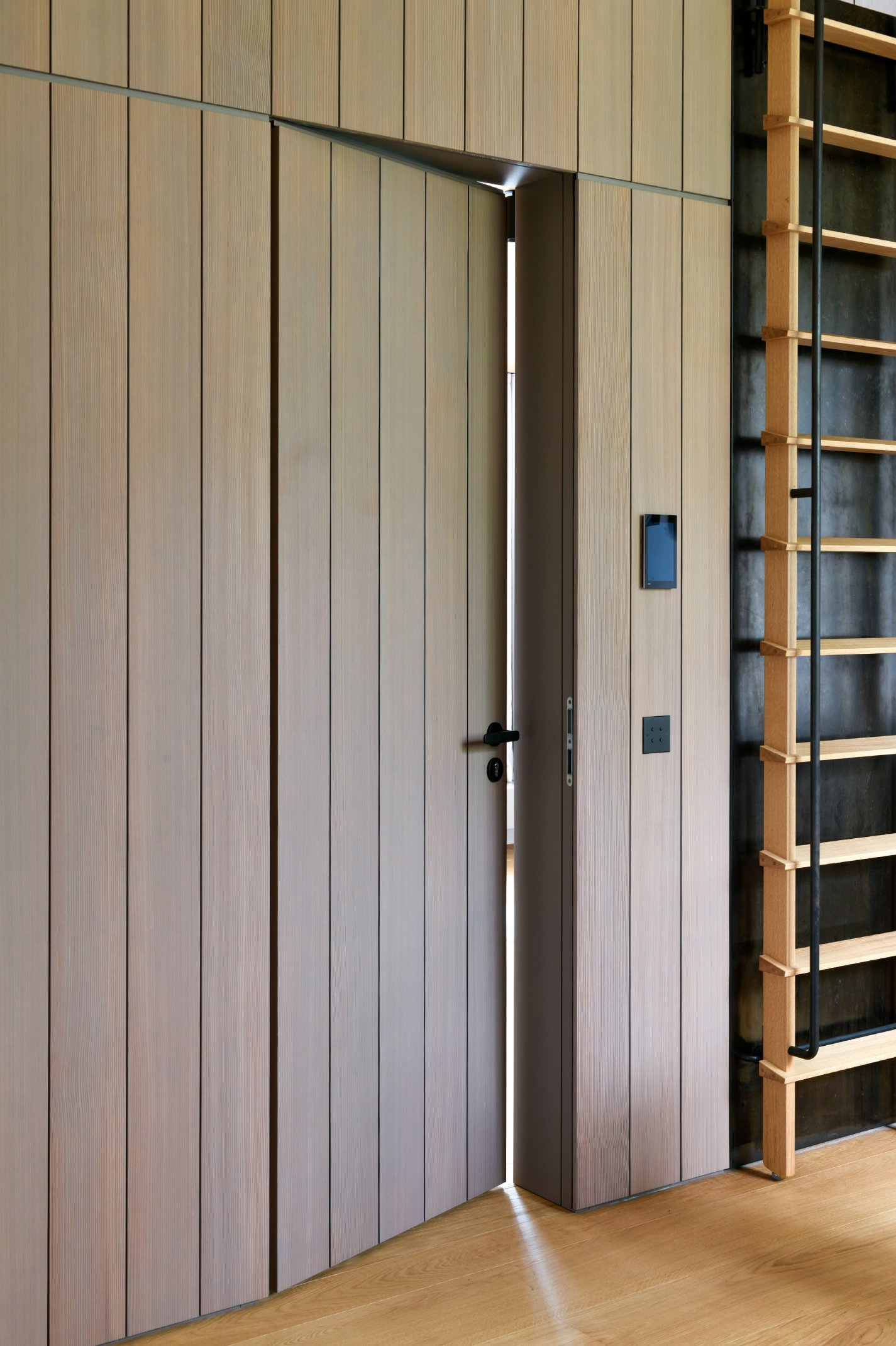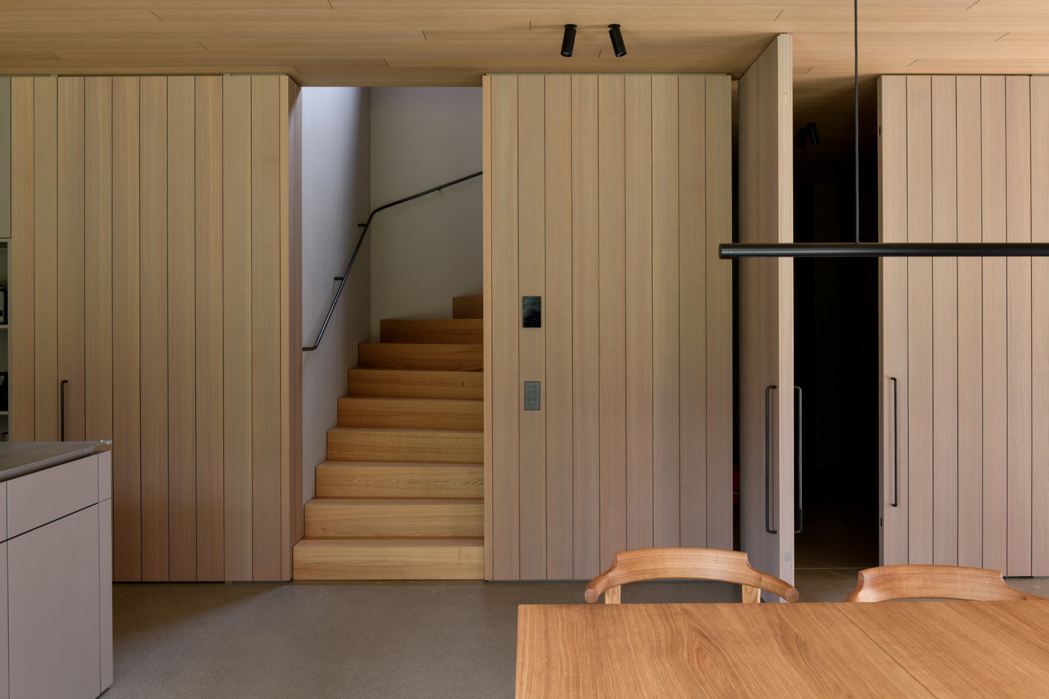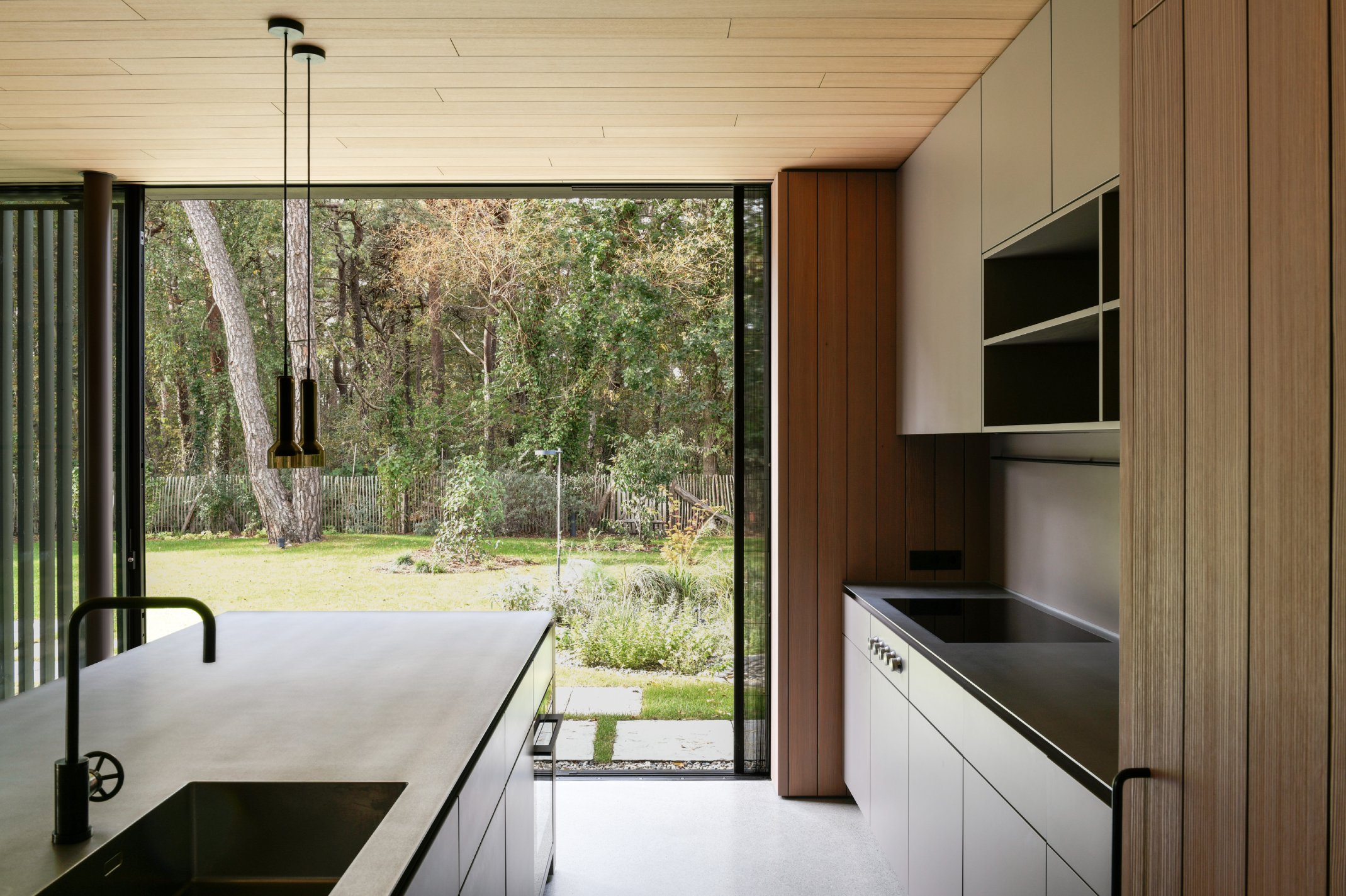 Die Innenräume sind durch hohe Detaillierung geprägt: Küchen, Bäder und Garderoben fügen sich nahtlos in das architektonische Konzept ein. Maßgefertigte Einbauten, darunter funktionale Medienregale und durchdachte Hauswirtschaftsbereiche, wurden präzise integriert. Hochwertige Materialien wie gebürstetes Lärchenfurnier, nasslackierte MDF-Oberflächen, Schwarzstahl und kaltgewalzter Edelstahl prägen die Innenraumgestaltung und unterstreichen die handwerkliche Qualität. Die warme Haptik der Holzbeläge steht im Dialog mit Sichtestrich und geschliffenem Naturstein. Ein besonderes Detail stellen die handgefertigten Bronze-Armaturen einer kleinen Manufaktur dar, die mit ihrer warmen Patina und einzigartigen Haptik die Wertigkeit der Gestaltung zusätzlich unterstreichen. Der Boden aus Walzterrazzo mit lokalem Buntkies der Ostseeregion verbindet robuste Langlebigkeit mit regionaler Verankerung und verleiht den Räumen eine subtile, natürliche Textur. Die sorgfältige Verarbeitung und die unsichtbare Integration technischer Elemente betonen die klare Formensprache und verstärken den Anspruch an eine nachhaltige Bauweise.