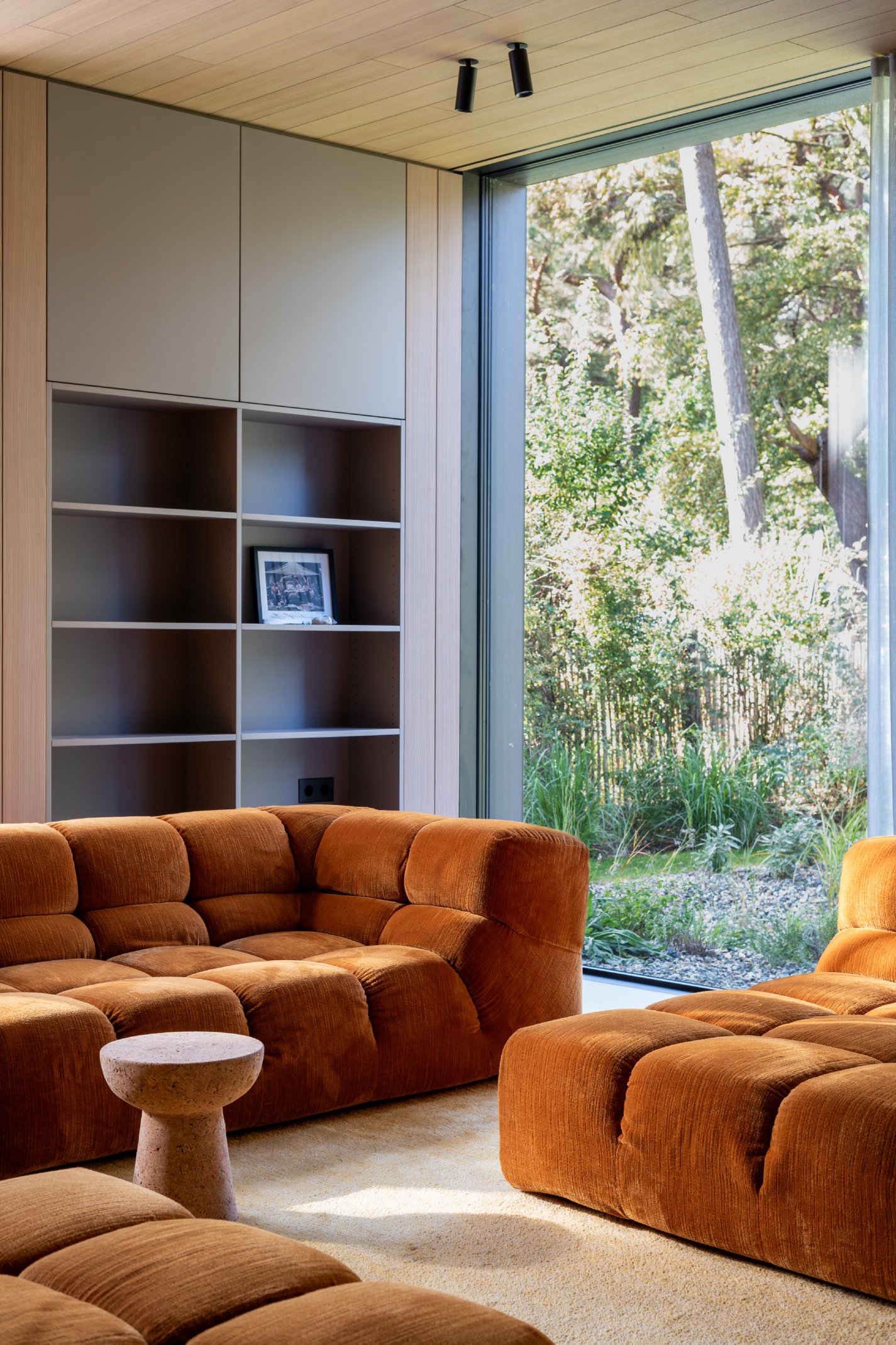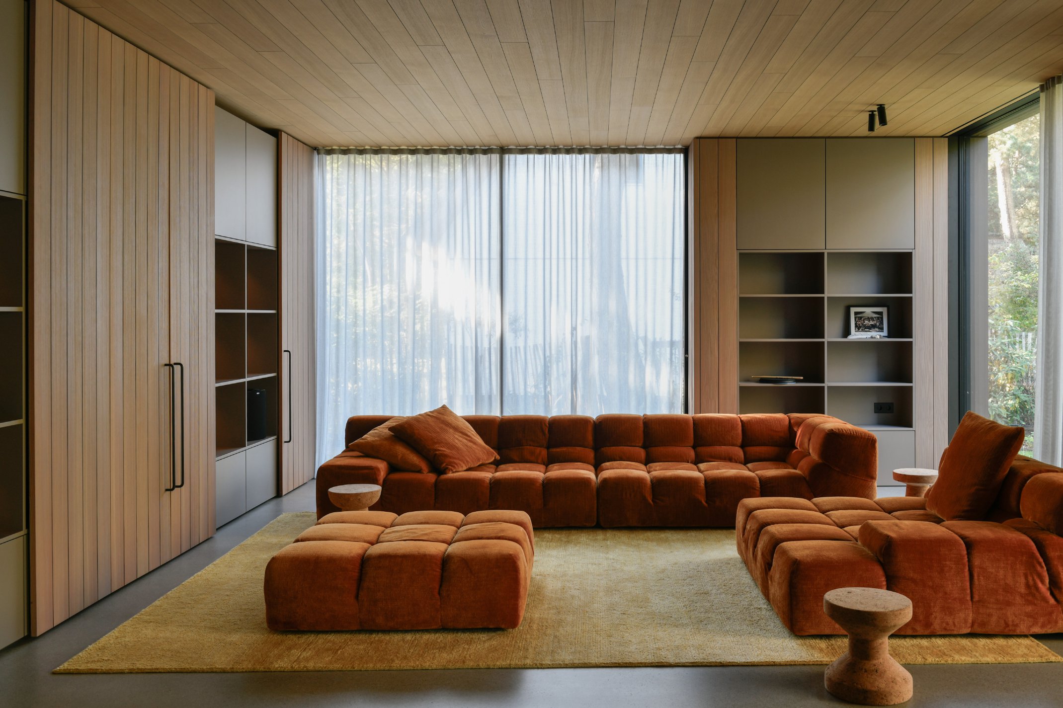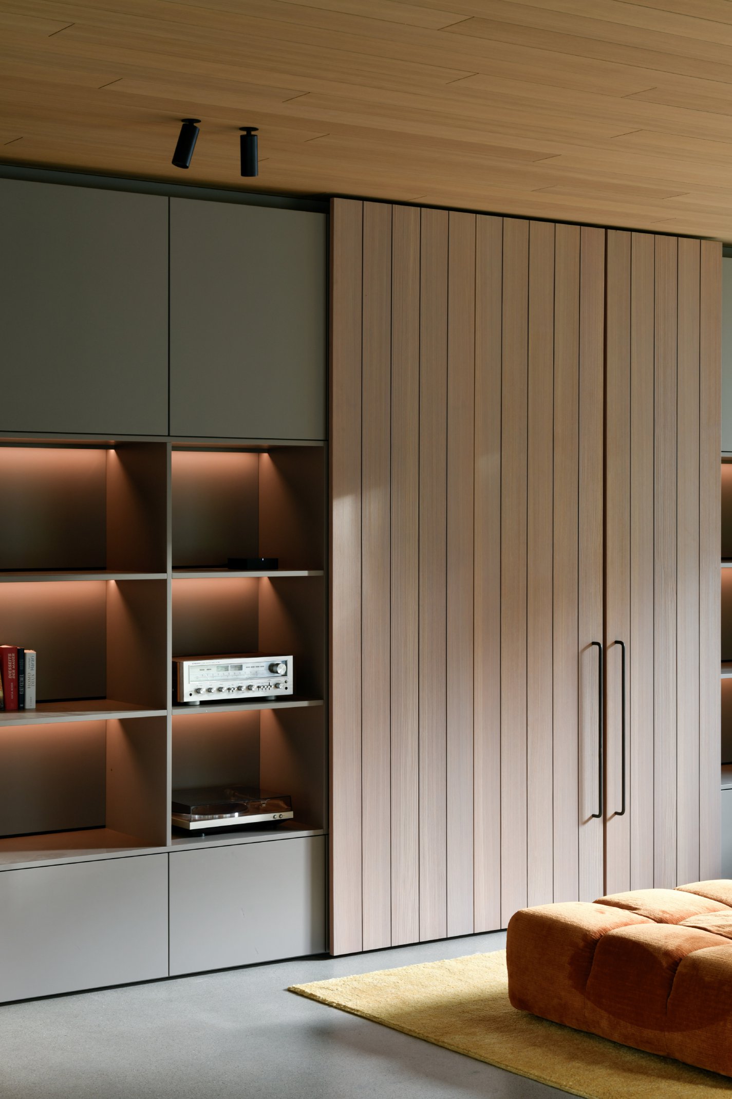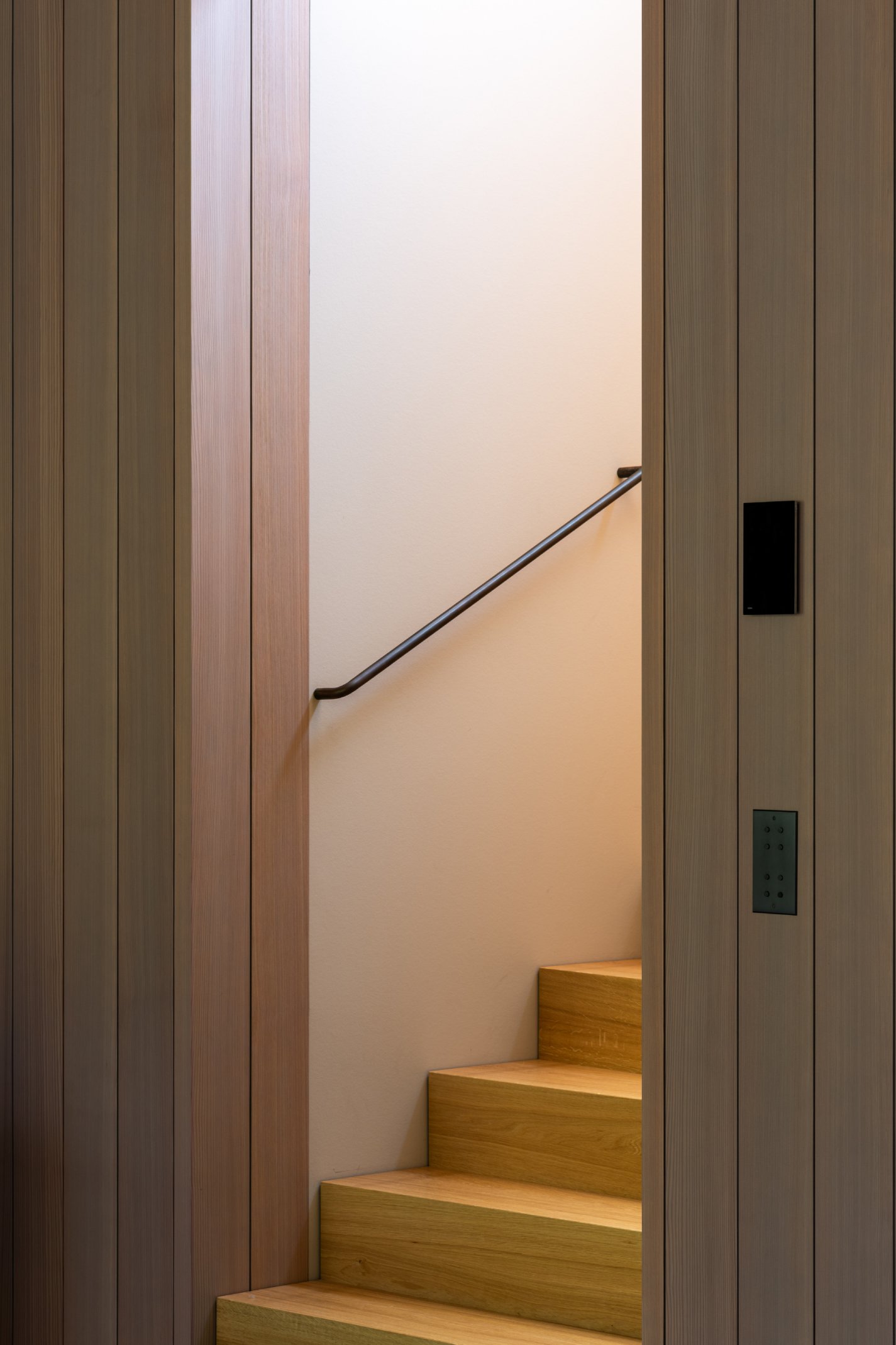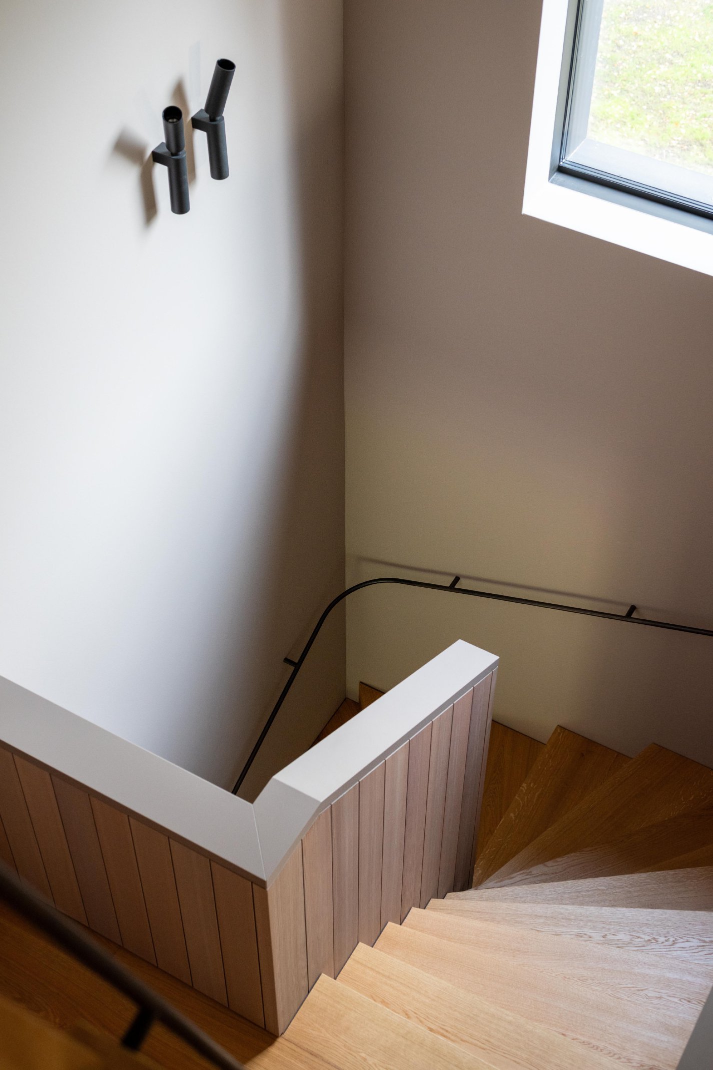Die Innenräume sind durch hohe Detaillierung geprägt: Küchen, Bäder und Garderoben fügen sich nahtlos in das architektonische Konzept ein. Maßgefertigte Einbauten, darunter funktionale Medienregale und durchdachte Hauswirtschaftsbereiche, wurden präzise integriert. Hochwertige Materialien wie gebürstetes Lärchenfurnier, nasslackierte MDF-Oberflächen, Schwarzstahl und kaltgewalzter Edelstahl prägen die Innenraumgestaltung und unterstreichen die handwerkliche Qualität. Die warme Haptik der Holzbeläge steht im Dialog mit Sichtestrich und geschliffenem Naturstein. Ein besonderes Detail stellen die handgefertigten Bronze-Armaturen einer kleinen Manufaktur dar, die mit ihrer warmen Patina und einzigartigen Haptik die Wertigkeit der Gestaltung zusätzlich unterstreichen. Der Boden aus Walzterrazzo mit lokalem Buntkies der Ostseeregion verbindet robuste Langlebigkeit mit regionaler Verankerung und verleiht den Räumen eine subtile, natürliche Textur. Die sorgfältige Verarbeitung und die unsichtbare Integration technischer Elemente betonen die klare Formensprache und verstärken den Anspruch an eine nachhaltige Bauweise.