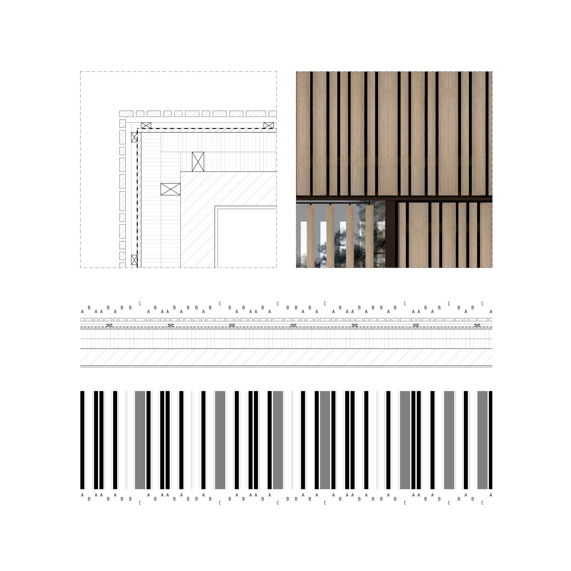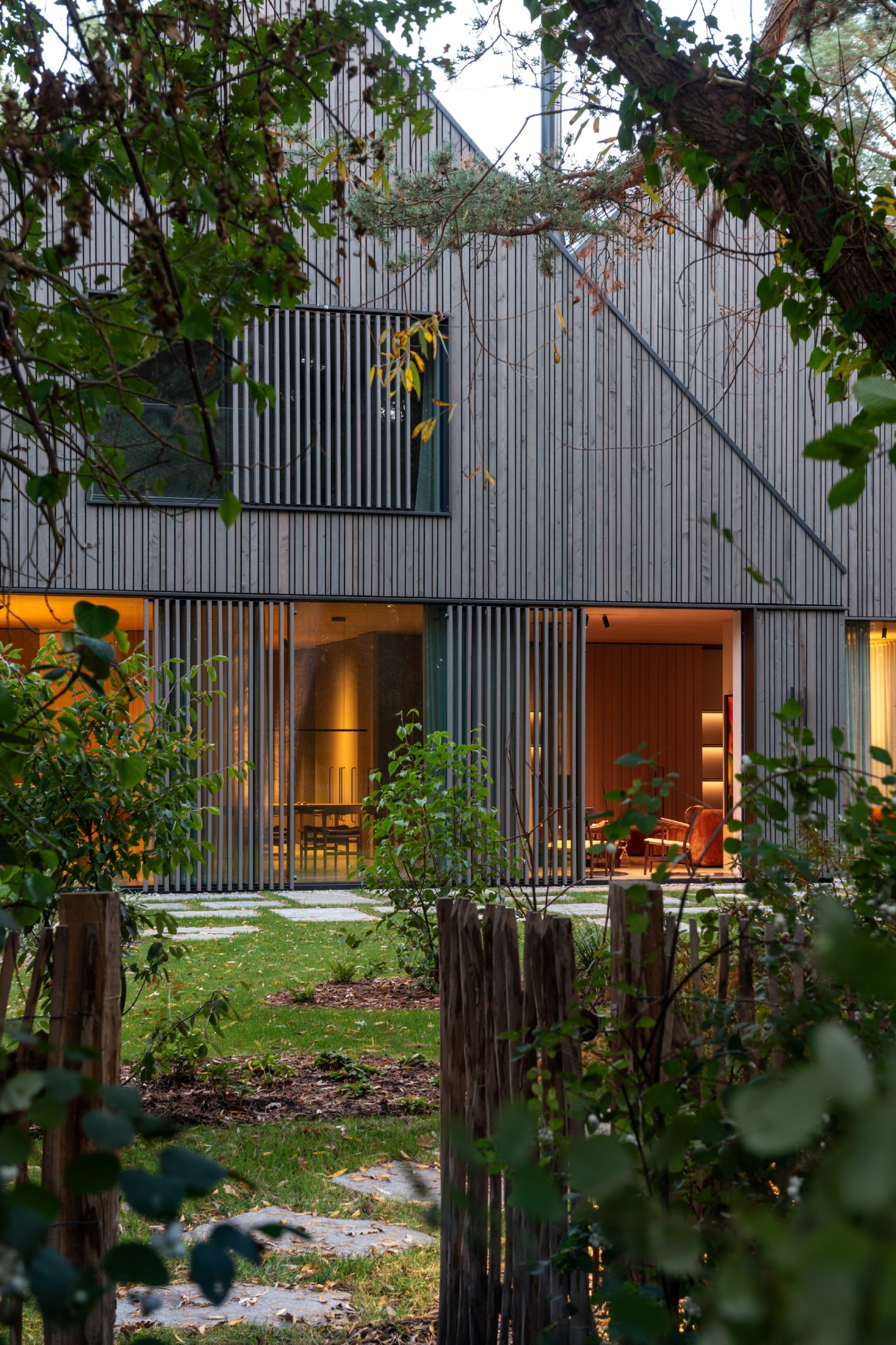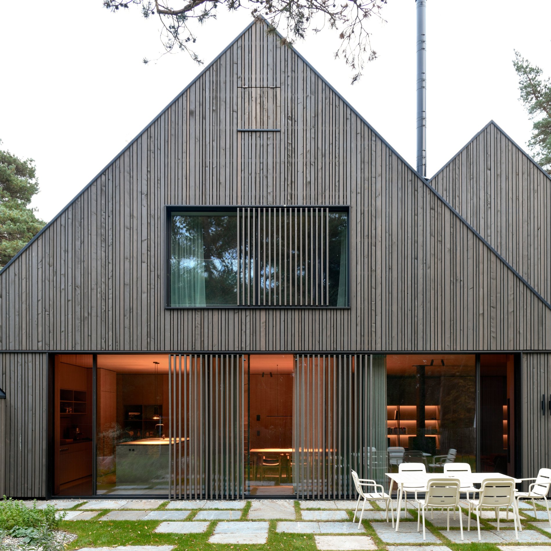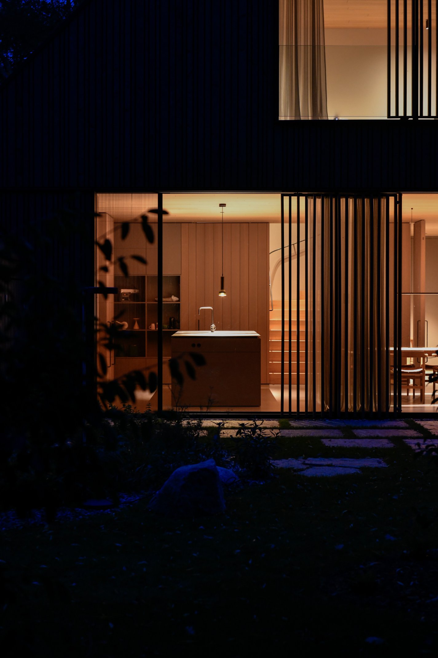 Das individuell entwickelte Fassadensystem mit einer offenen Profilholzschalung in vergrauter Lärche integriert funktionale Elemente unauffällig in die Gebäudehülle, sodass eine klare Architektursprache erhalten bleibt. Die rahmenlosen Fensterelemente, die als Sonderbauteile ausgeführt sind, ermöglichen eine nahtlose Integration des Sonnenschutzes und der in den Fensterlaibungen versteckten Insektenschutz-Plissees. Vorgelagerte variable Sichtlamellen bieten kombiniert mit dem innenliegenden Blendschutz eine gezielte Steuerung von Transparenz und Privatsphäre. Große Glasflächen sorgen für eine lichtdurchflutete Atmosphäre und ermöglichen ein unmittelbares Erleben der umgebenden Landschaft.