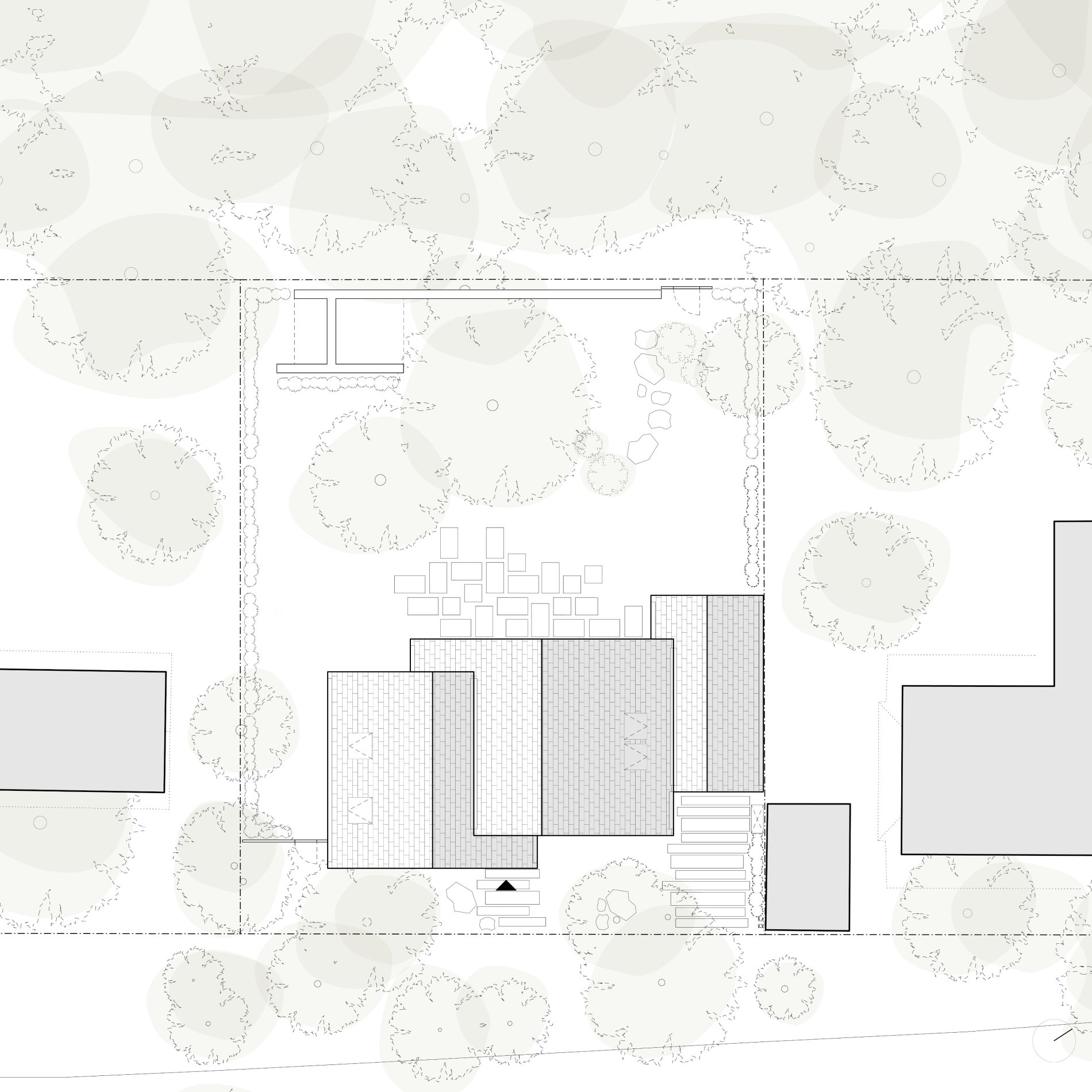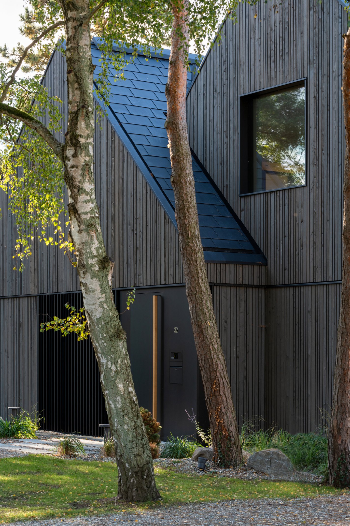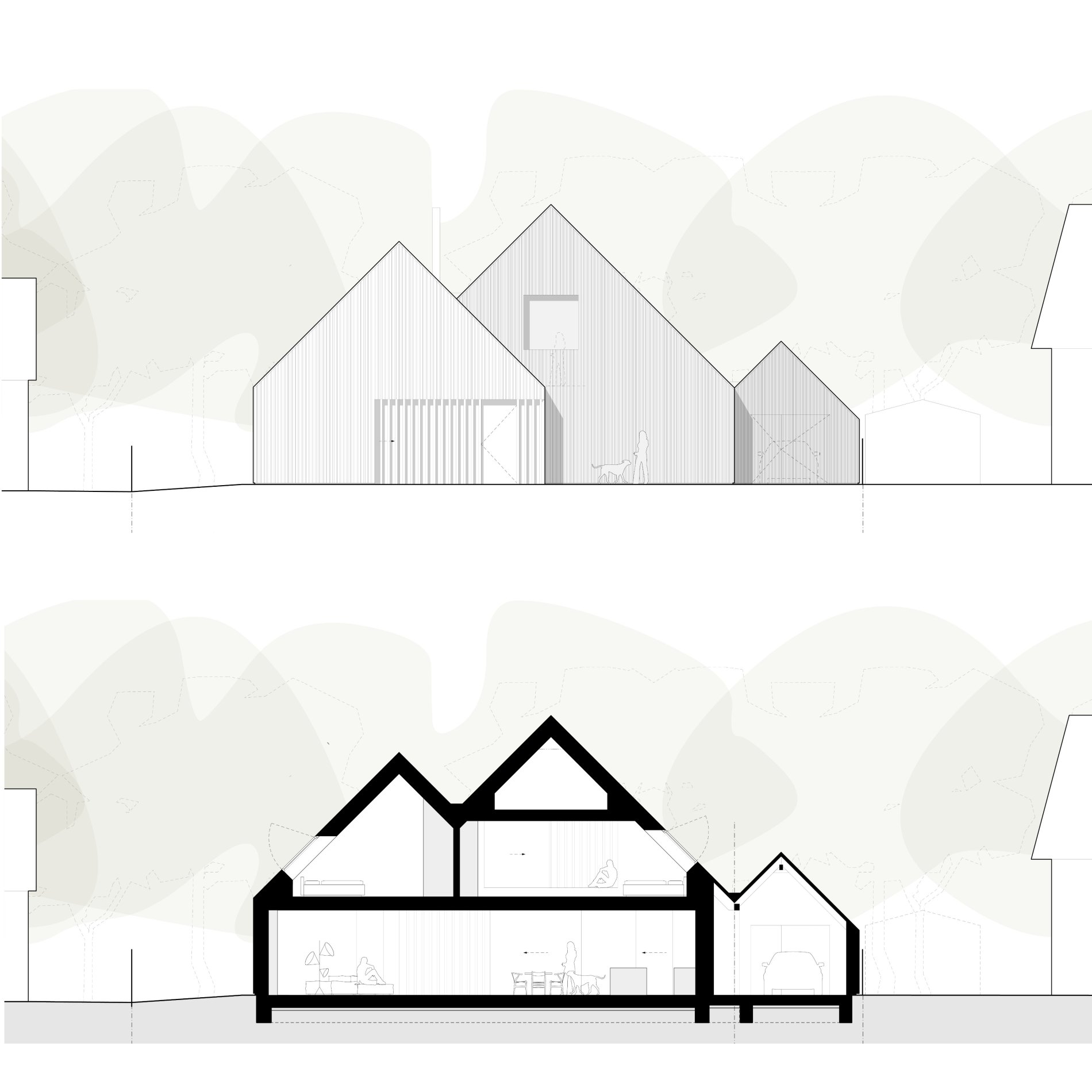 Früh wurde deutlich, dass die Abmessungen der Umgebungsbebauung für das anvisierte Raumprogramm nicht ausreichen würden. Zudem schloss die Lage an der Küste mit einem hohen Grundwasserspiegel die Möglichkeit eines Kellers aus, sodass der gesamte Raumbedarf oberirdisch organisiert werden musste. Vor diesem Hintergrund entstand das Konzept, drei kleinere, archetypische Baukörper zu einem einzigen, zweigeschossigen Gebäude zu verschränken. Diese volumetrische Strategie ermöglicht es, den Maßstab der umgebenden Bebauung weiterzubauen und ein funktionales Wohnhaus mit angeschlossener Garage zu realisieren.