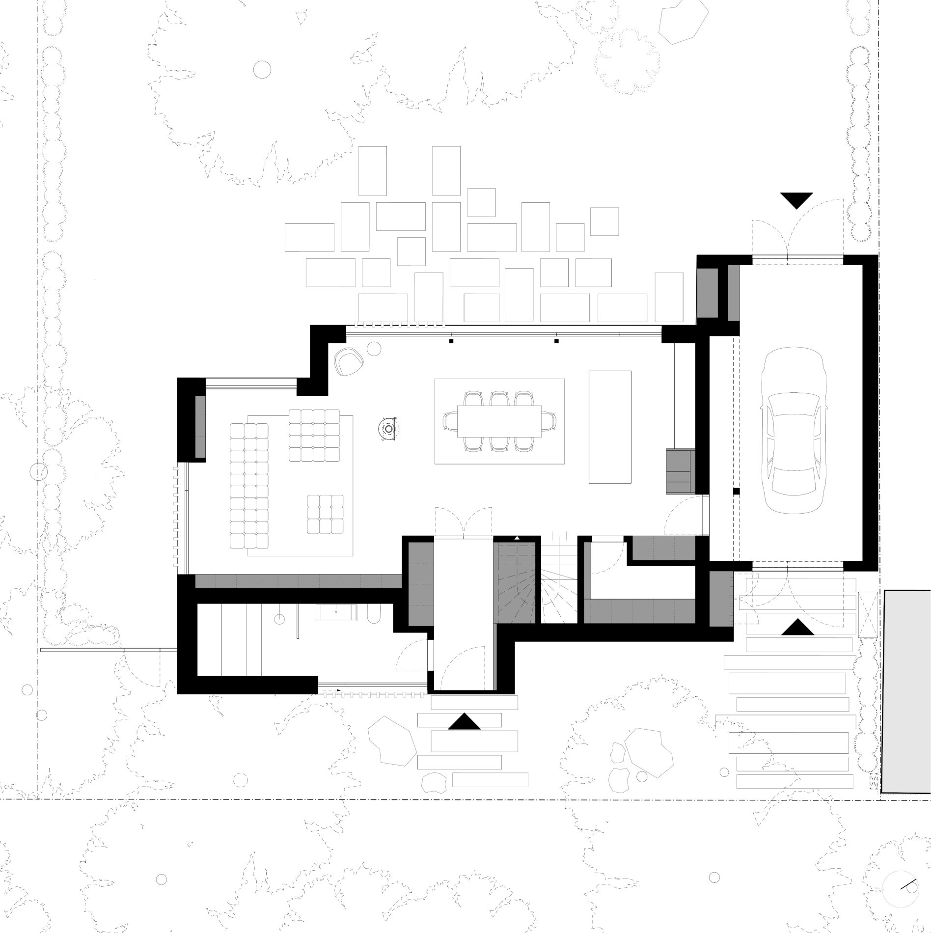 Im Erdgeschoss bestimmen großzügige, stützenfreie Räume die Atmosphäre. Die Funktionsbereiche Wohnen, Essen, Kochen, Entree und Garage sind als zusammenhängendes Raumkontinuum konzipiert und können flexibel über großformatige Pivot-Türen zoniert werden. Eine vollverglaste Gartenfront erweitert den Innenraum nach außen und sorgt für einen fließenden Übergang zwischen dem Gebauten und der Natur. Die Garage lässt sich durch große Tore zum Garten hin öffnen, sodass sie im Sommer als zweites Wohnzimmer genutzt werden kann.