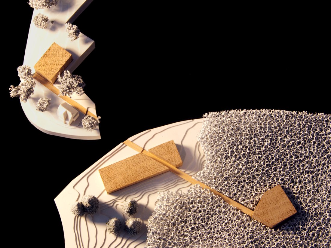 Die drei Gebäude entwicklen sich entlang einer Achse, ausgehend von der Villa Klump in Richtung Tal und reagieren in ihrer Ausrichtung auf die örtlichen Begebenheiten. Die Achse bildet den neuen Ausstellungspfad und verbindet alle Gebäude miteinander. Zwischen Empfangsgebäude und Ausstellungsturm wird sie in luftiger Höhe zum Baumwipfelpfad.