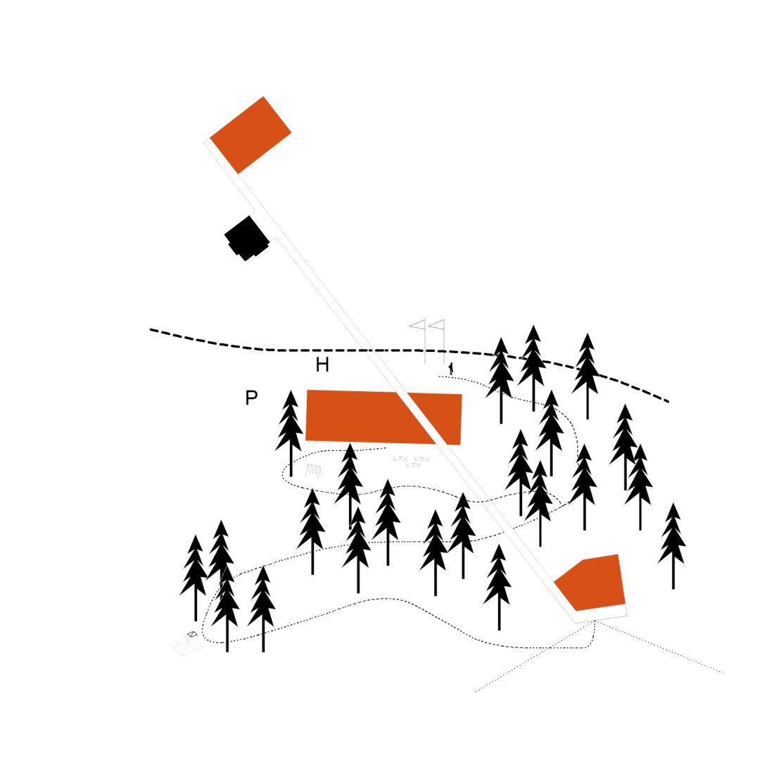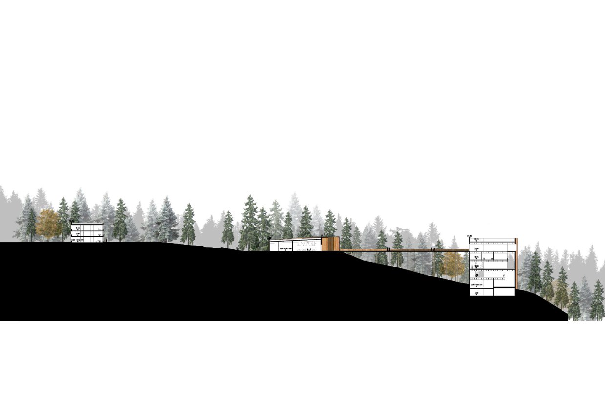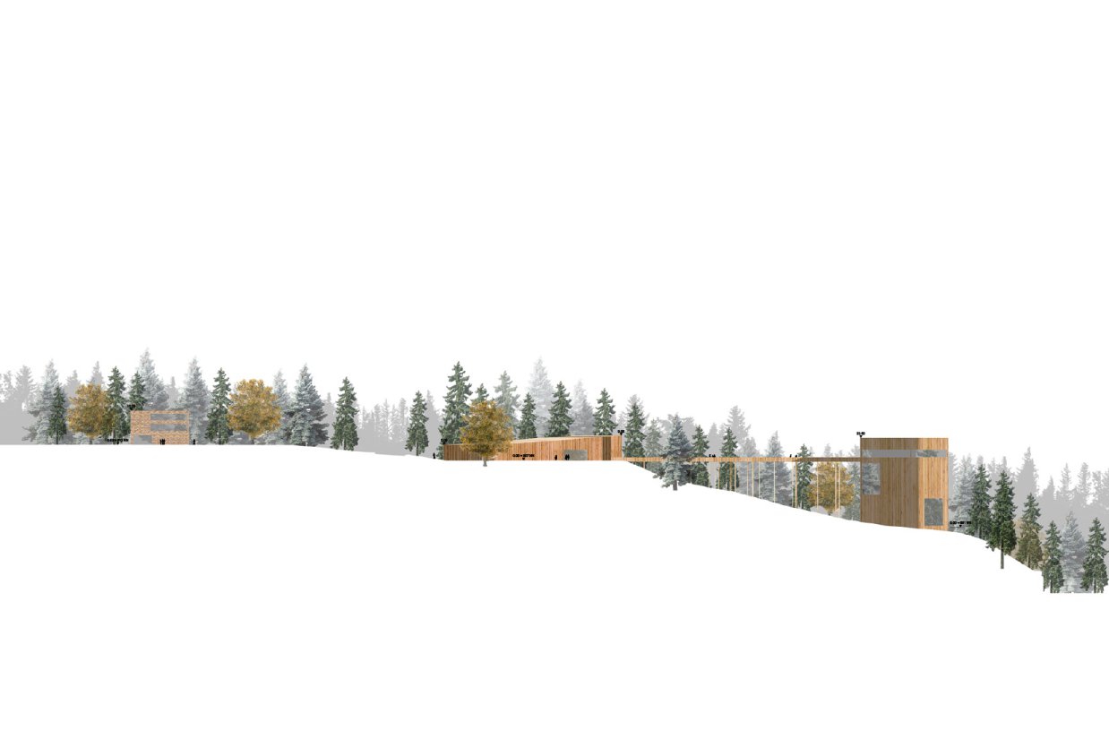 Der Entwurf teilt das gegebene Programm in drei einzelne Gebäude auf. Ein Empfangsgebäude als zentralen Verteiler, ein Verwaltungsgebäude in räumlicher Nähe zur Villa Klump und einen in den Wald eingebetteten Ausstellungsturm. Entsprechend der regionalen Bautradition sollen alle Gebäude in Holzbauweise errichtet werden.