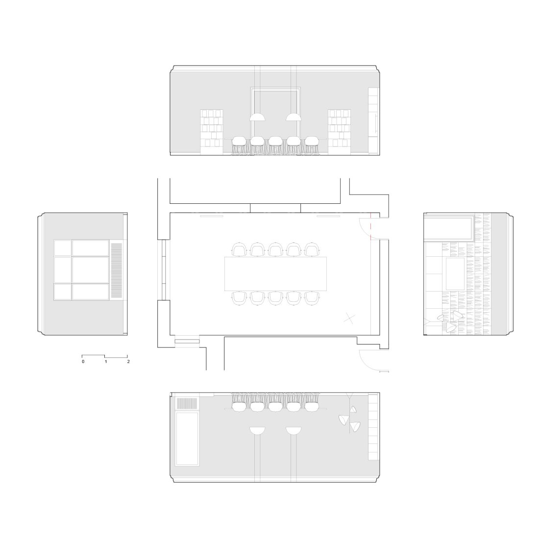 Im Zentrum des Entwurfes steht ein schwebend anmutender großzügiger Tisch mit Platz für bis 12 Personen. Sämtliche Bücher und Medien finden in einem raumhohen Wandregal auf der Schmalseite des Raumes Platz. Locker an die Wand gelehnte Magazinracks bieten einen Überblick über das aktuelle Mediengeschehen.