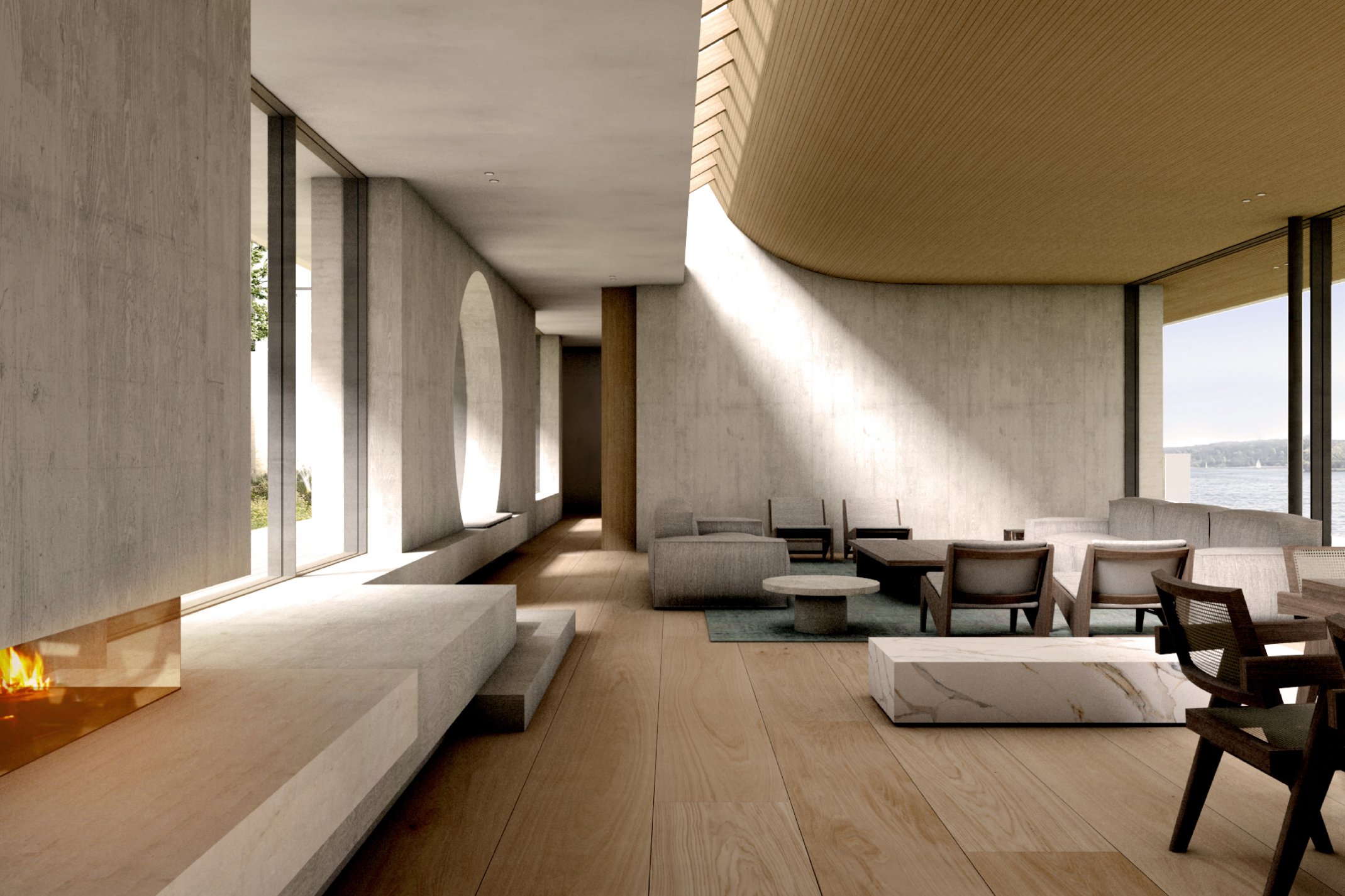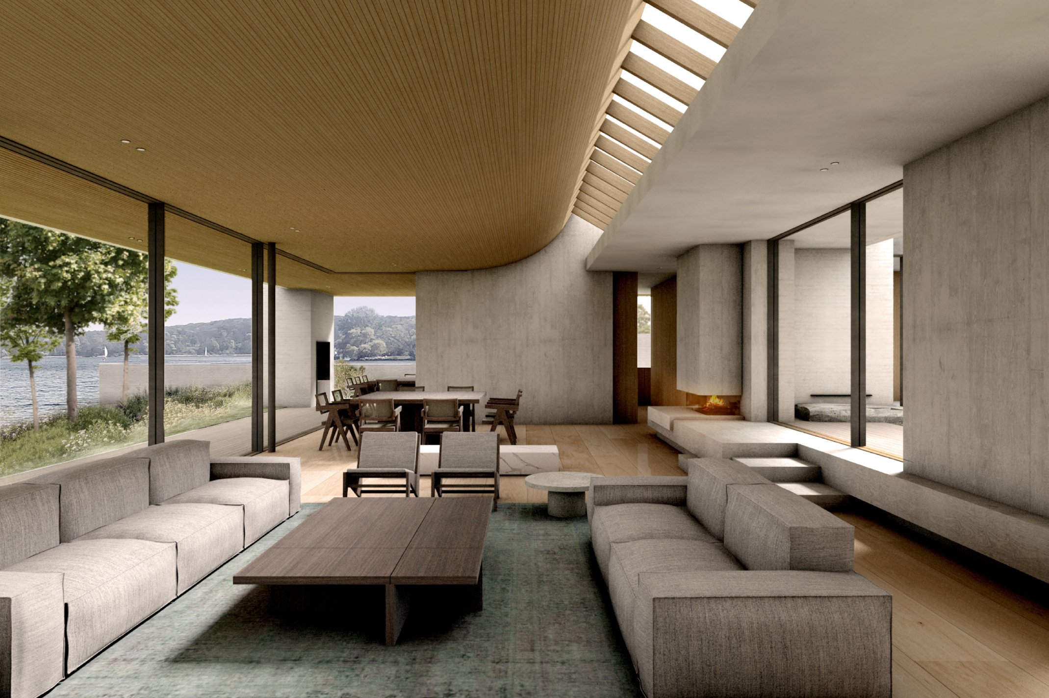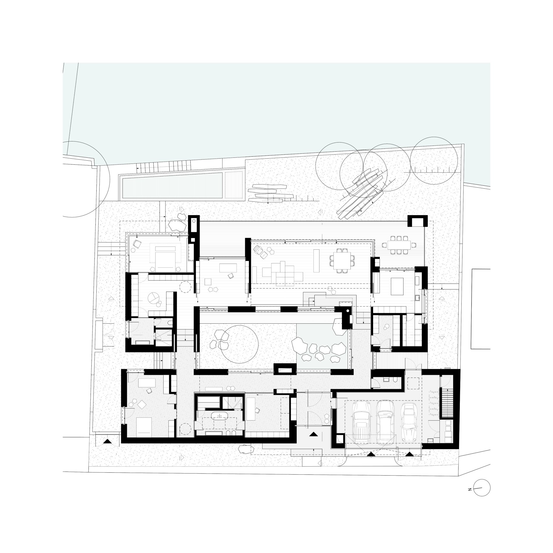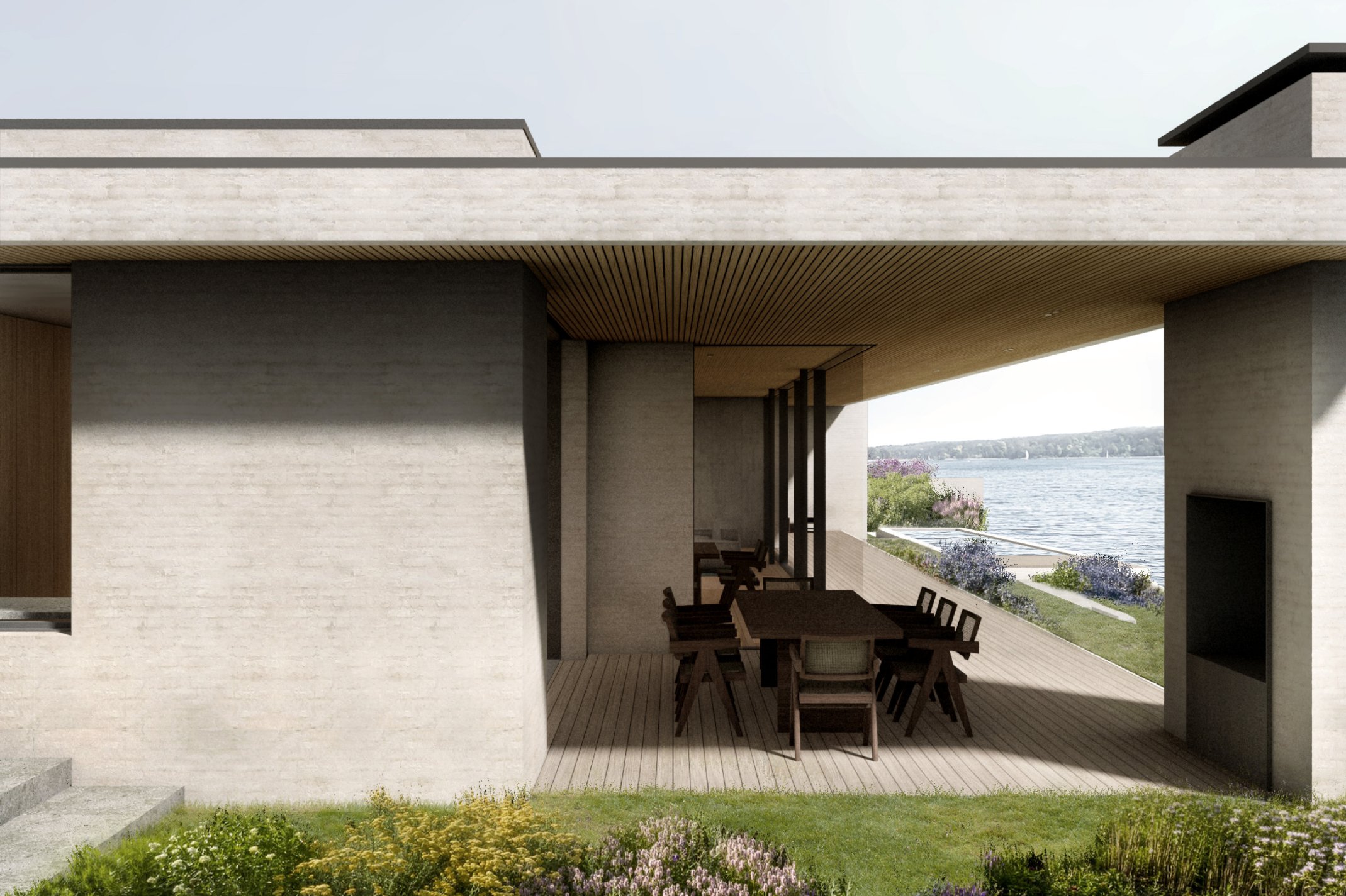 Zum See öffnet sich das Gebäude über die gesamte Gebäudebreite zu einer großzügigen, überdachten Terrasse, die den Blick über das Wasser inszeniert. Der begrünte Innenhof schafft intime Raumsituationen im Außenbereich, setzt die angrenzenden Räume miteinander in Beziehung und belichtet sie ohne Einblicke von außen zu gewähren.