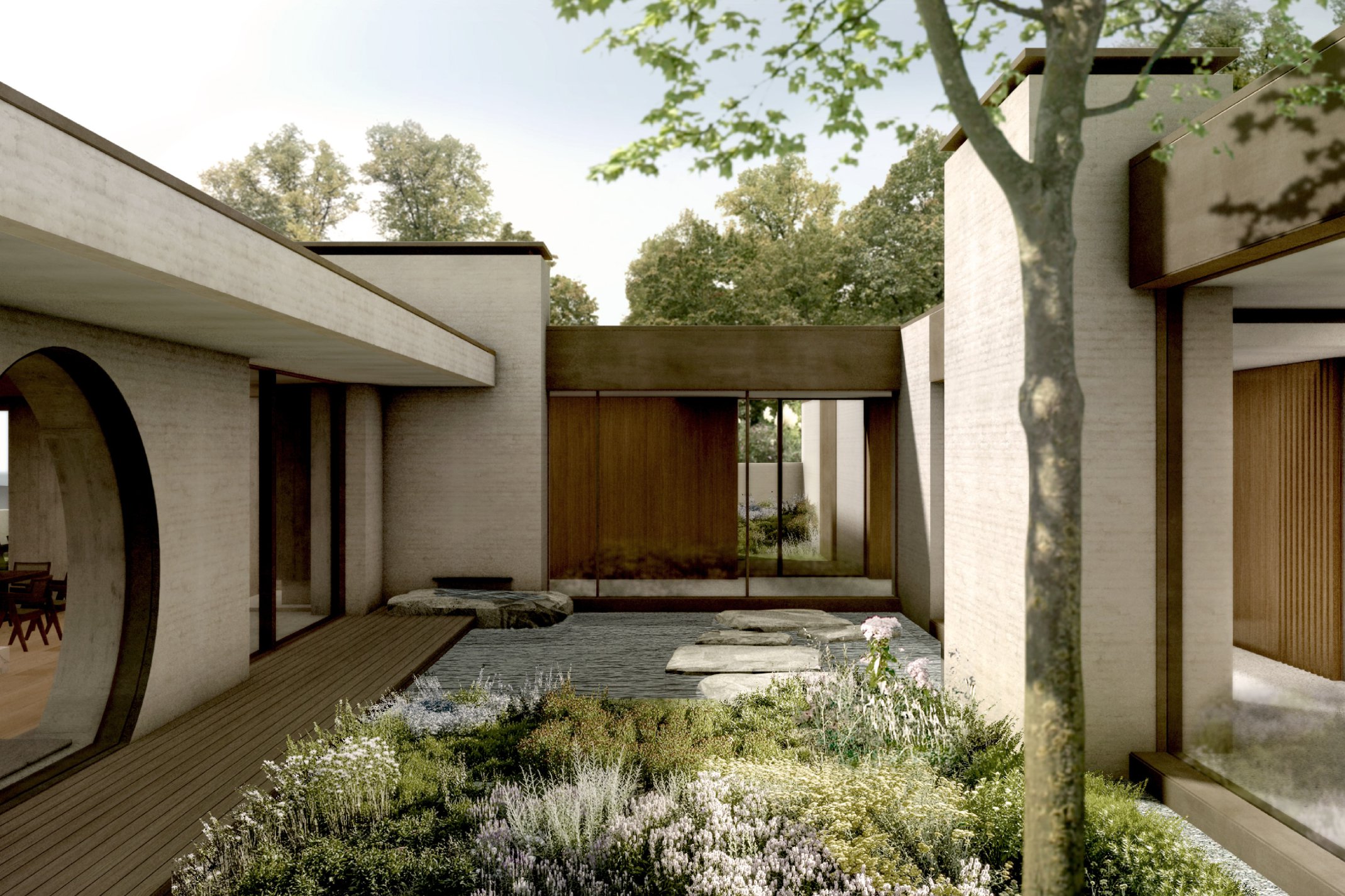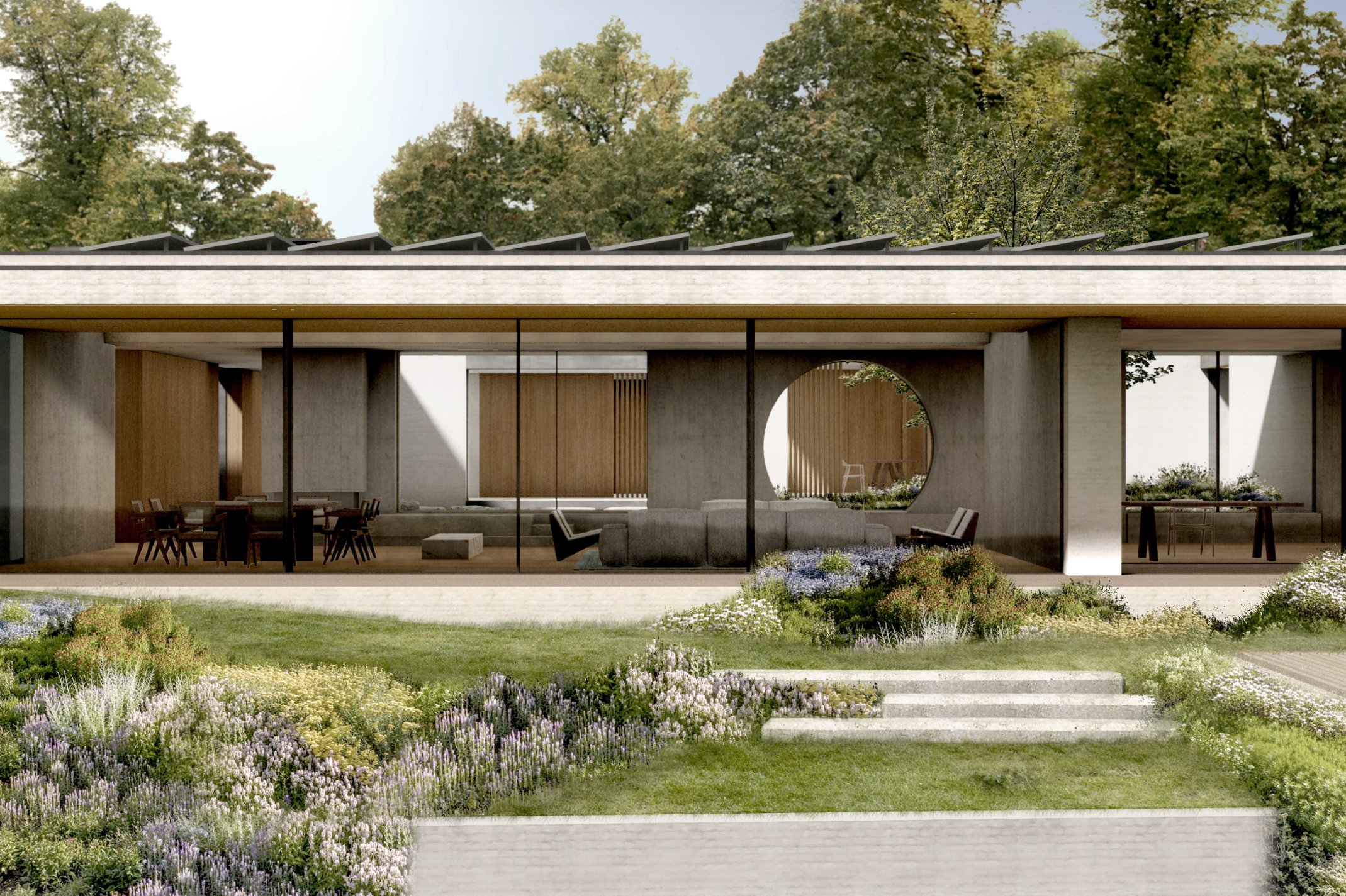 Die Fassade aus geschlämmtem Mauerwerk und Holzelementen greift die Materialität der historischen Gebäude des Neuen Gartens auf und verleiht dem Gebäude ein natürliches, zeitlos wertiges Erscheinungsbild. Im Inneren wird die Materialpalette durch Sichtbetonwände und Holzdecken sowie Terrazzoböden und großformatige Eichendielen ergänzt.