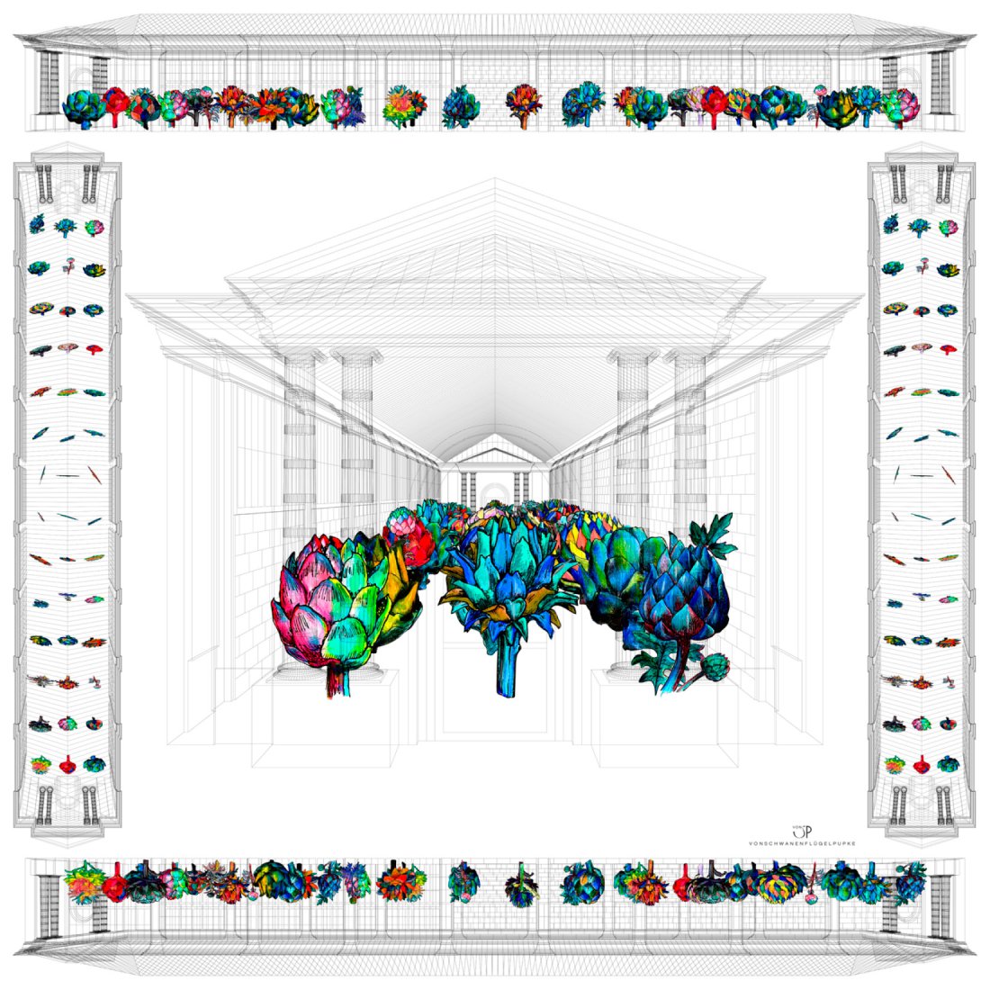 Für die Herbst/Winterkollektion 2013 des Modelabel VONSCHWANENFLÜGELPUPKE wurden prägnanter Architekturen aus Berlin und Paris im Rechner als dreidimensionale Raummodelle erzeugt. Die daraus resultierenden Visualisierungen bildeten die Grundlage für die grafische Gestaltung und Umsetzung großformatiger Stoffdrucke für die Herbst/Winter Kollektion 2013.