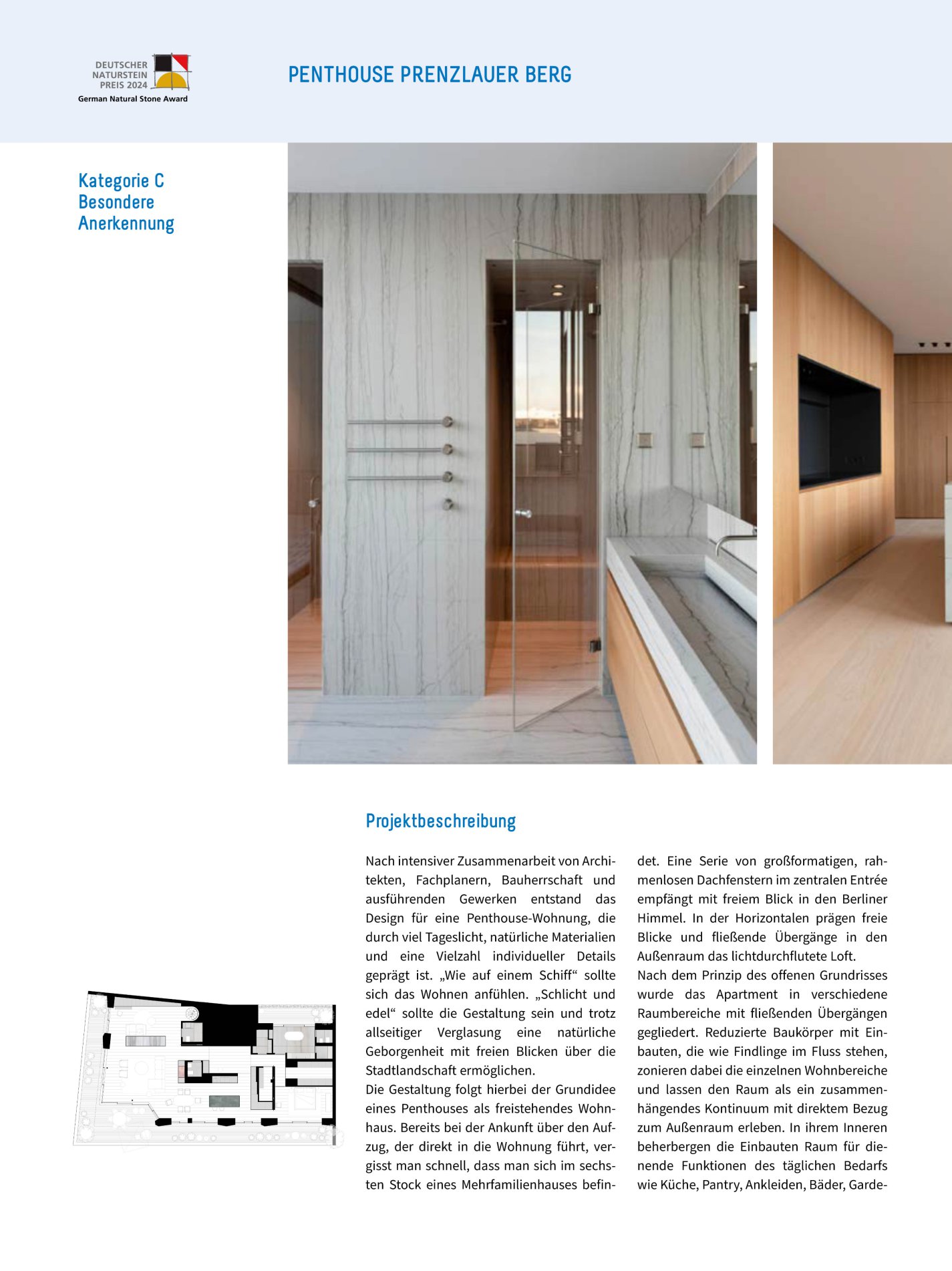 Wir freuen uns über die besondere Anerkennung unseres Projekts Penthouse Berlin Prenzlauer Berg beim Deutschen Naturstein-Preis 2024. Tausend Dank an alle Beteiligten für die großartige Leistung mit diesem einzigartigen Material.