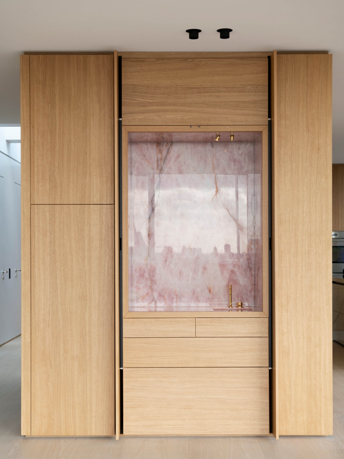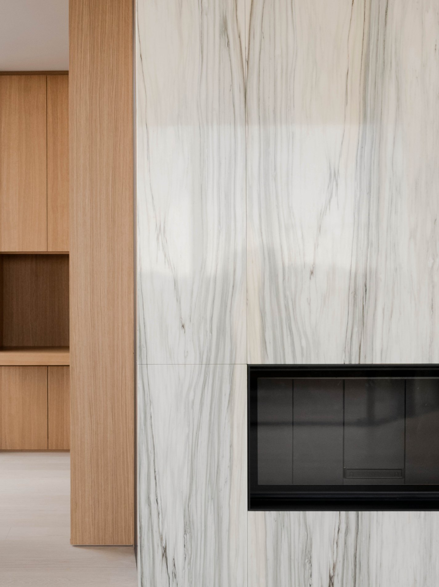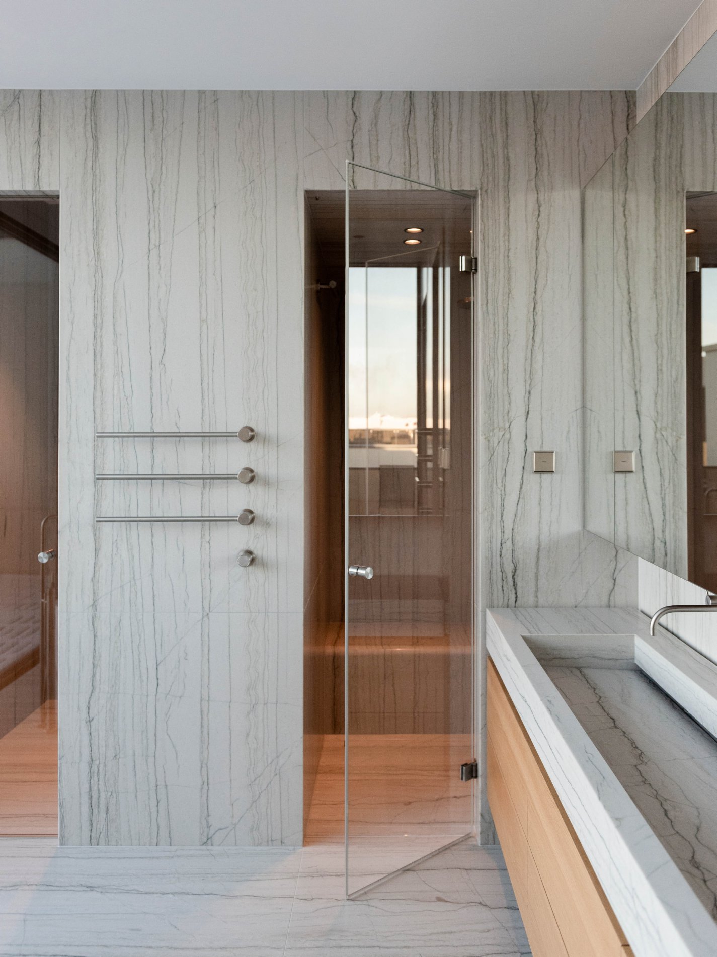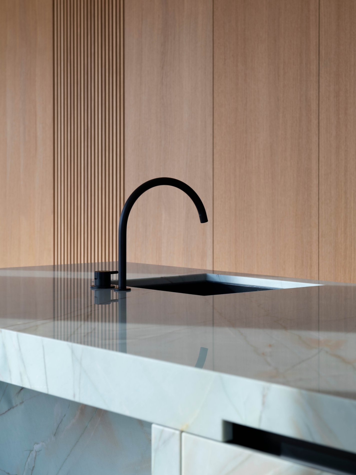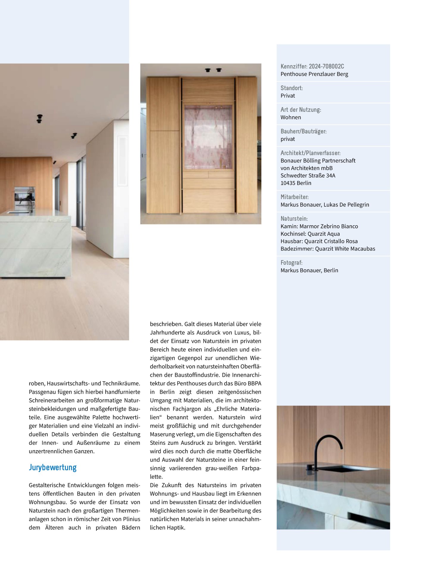 Die Innenarchitektur des Penthouses durch das Büro BBPA in Berlin zeigt diesen zeitgenössischen Umgang mit Materialien, die im architektonischen Fachjargon als „Ehrliche Materialien“ benannt werden. Naturstein wird meist großflächig und mit durchgehender Maserung verlegt, um die Eigenschaften des Steins zum Ausdruck zu bringen. Verstärkt wird dies noch durch die matte Oberfläche und Auswahl der Natursteine in einer feinsinnig variierenden graueißen Farbpalette. Die Zukunft des Natursteins im privaten Wohnungs- und Hausbau liegt im Erkennen und im bewussten Einsatz der individuellen Möglichkeiten sowie in der Bearbeitung des natürlichen Materials in seiner unnachahmlichen Haptik.”