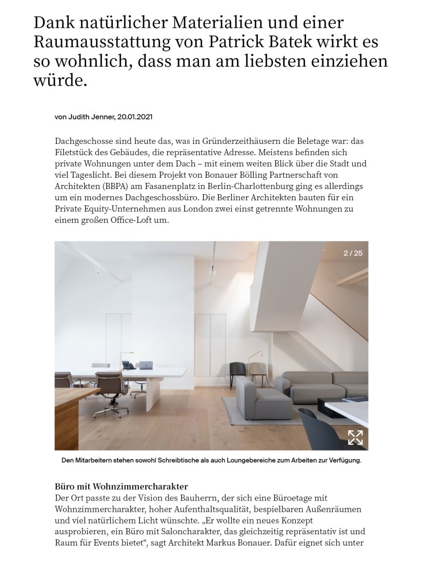 “Das Berliner Architekturbüro Bonauer Boelling BBPA legte unter dem Dach eines Gründerzeitbaus in Berlin-Charlottenburg zwei Wohnungen zu einem Büro mit großer Dachterrasse zusammen. Dank natürlicher Materialien und einer Raumausstattung von Patrick Batek wirkt es so wohnlich, dass man am liebsten einziehen würde.