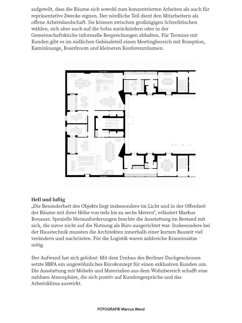 Der Aufwand hat sich gelohnt: Mit dem Umbau des Berliner Dachgeschosses setzte BBPA ein ungewöhnliches Bürokonzept für einen exklusiven Kunden um. Die Ausstattung mit Möbeln und Materialien aus dem Wohnbereich schafft eine nahbare Atmosphäre, die sich positiv auf Kundengespräche und das Arbeitsklima auswirkt.”